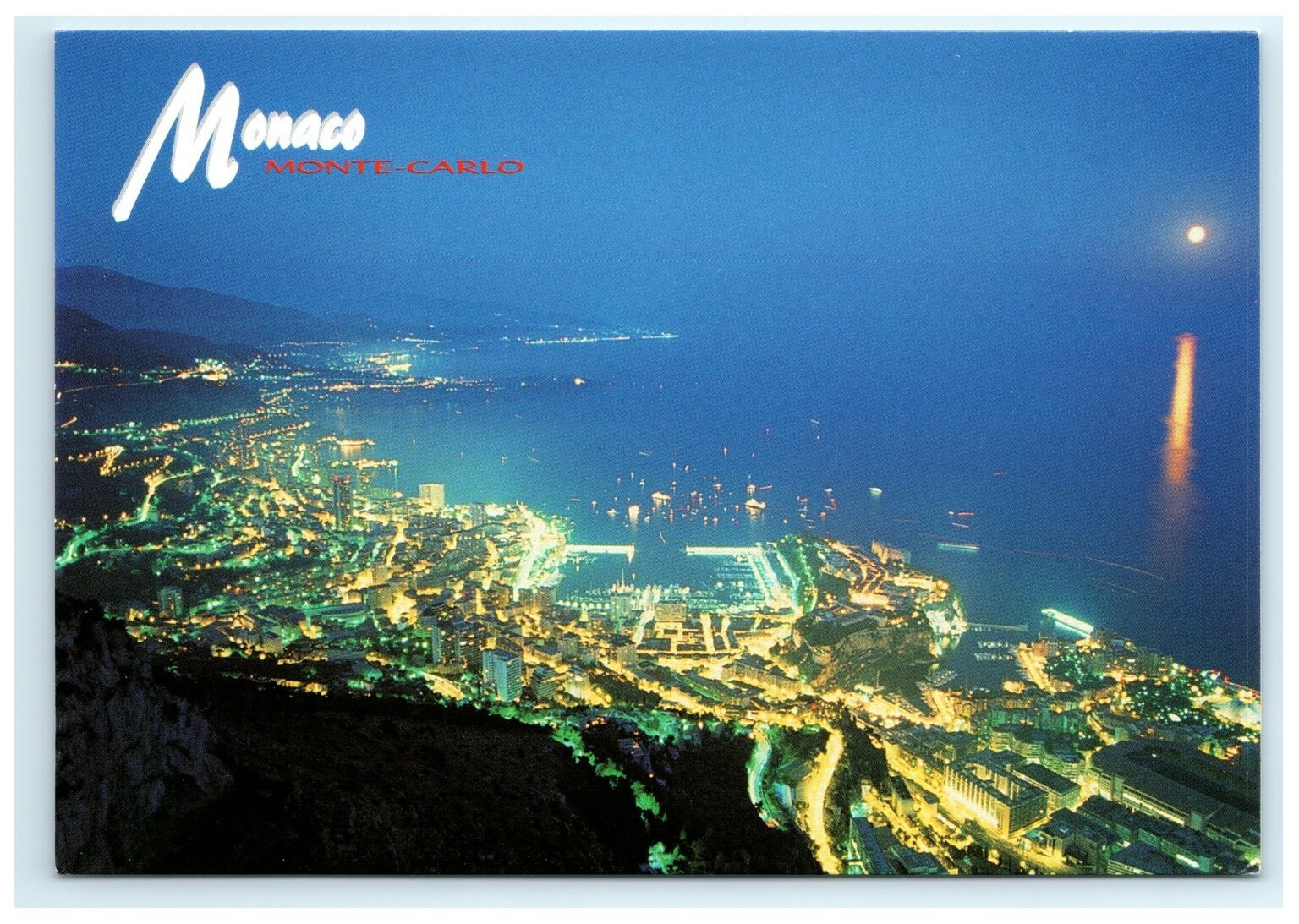 This stunning vintage postcard captures a breathtaking night-time aerial view of Monaco and Monte-Carlo along the French Riviera. The image showcases the vibrant city lights reflecting on the Mediterranean Sea, with a glowing moon adding a serene touch to the coastal landscape. The postcard features lithographic printing, giving it rich colors and sharp details that highlight the unique charm of this famed luxury destination.
