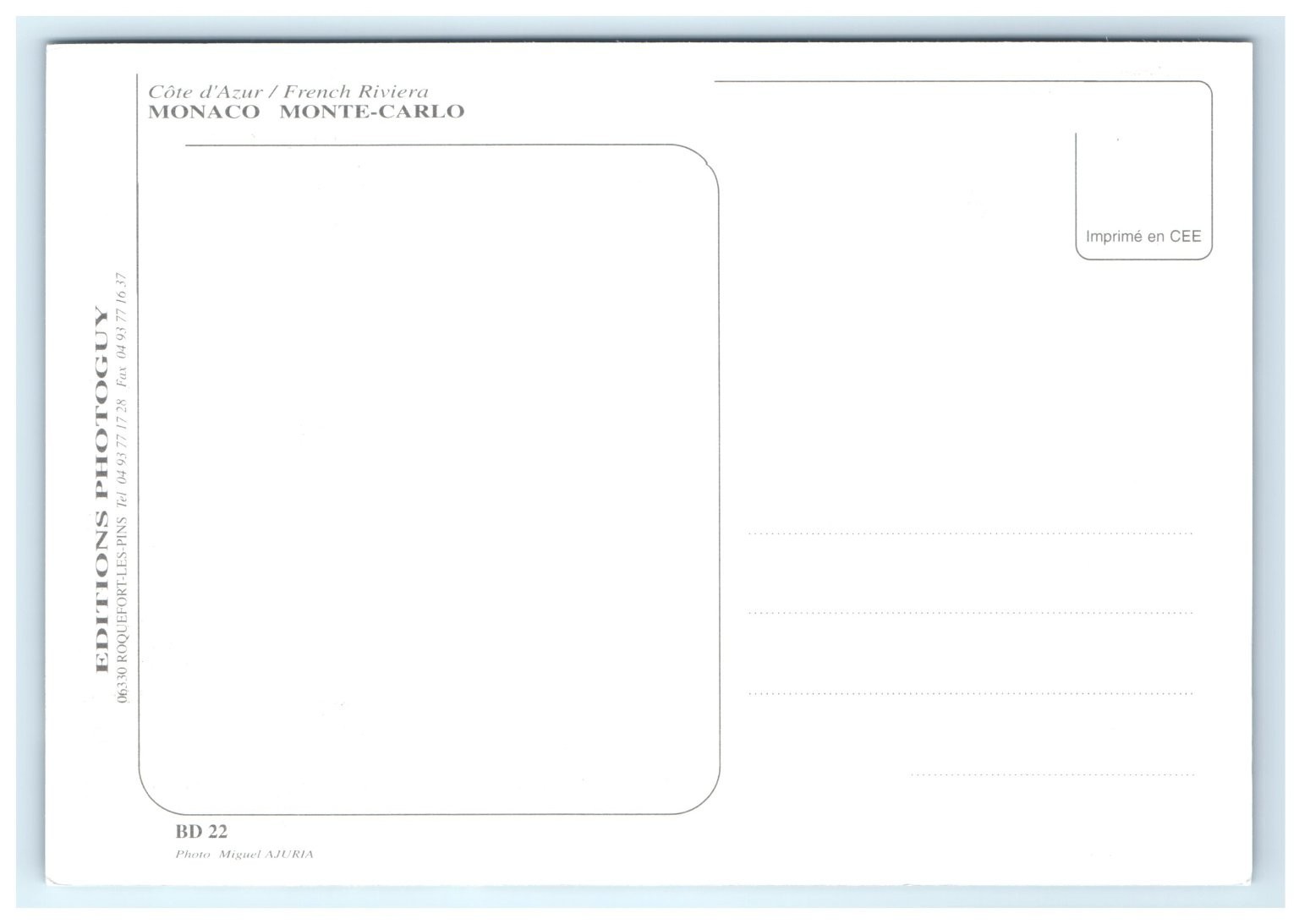 Published by Editions Photoguy, this original chrome postcard measures approximately 6 x 4 inches, fitting the continental size category. It is part of the Cote d'Azur collection and credited to photographer Miguel Ajuria. This collectible postcard showcases classic mid-to-late 20th century European postcard design and printing techniques, making it a valuable addition for enthusiasts of vintage travel memorabilia and scenic coastal views.