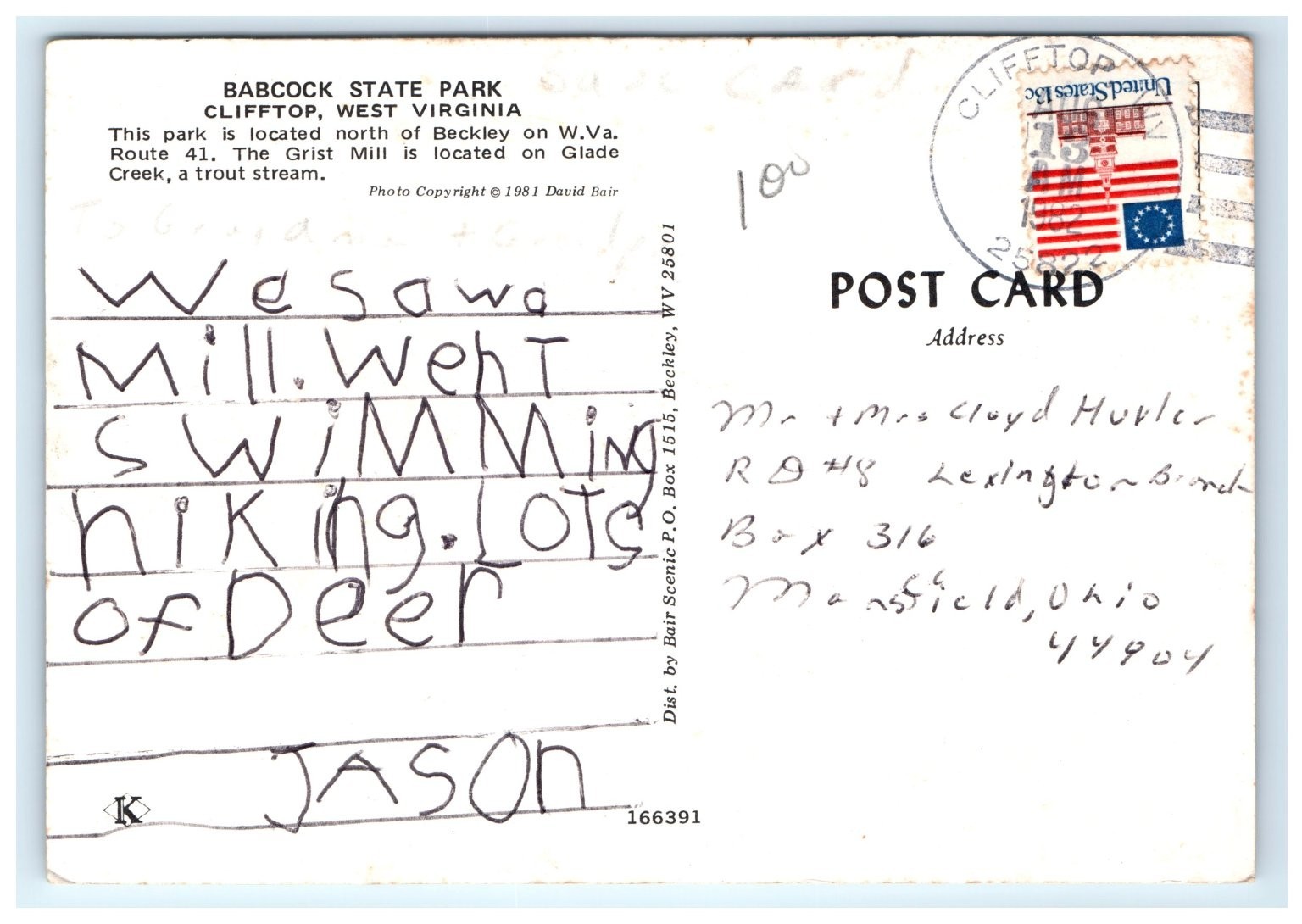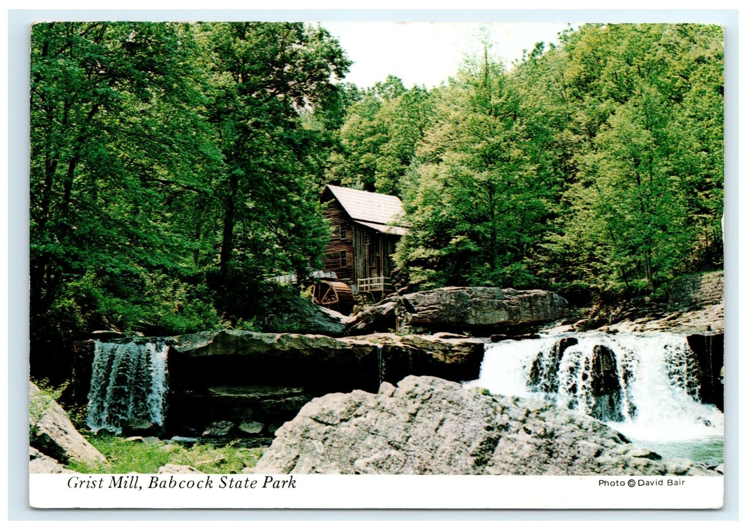 This vintage postcard features a picturesque view of the historic Grist Mill located in Babcock State Park, Clifftop, West Virginia. Captured in vivid lithograph color by photographer David Bair in 1981, the scene showcases the iconic wooden mill nestled among lush green trees beside a cascading waterfall on Glade Creek, a well-known trout stream. The postcard highlights the natural beauty and rustic charm of this popular park destination north of Beckley on West Virginia Route 41.