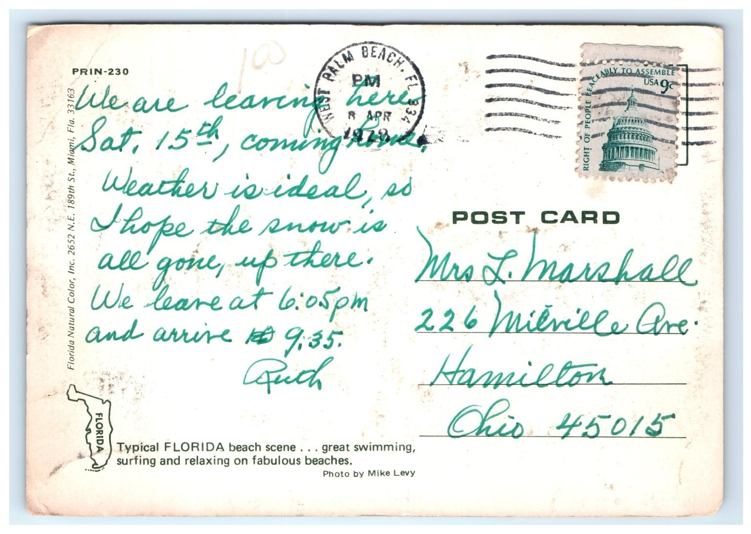 Published by Florida Natural Color, Inc., Miami, FL, this original chrome postcard (PRIN-230) highlights the popular leisure activities of swimming, surfing, and relaxing on Florida's fabulous beaches. The back of the card includes a handwritten message, dated April 14, with a West Palm Beach postmark and a 9-cent US postage stamp, adding to its historical and collectible appeal. Photographed by Mike Levy, this postcard is a beautiful example of mid-20th-century Florida tourism imagery and a must-have for postcard collectors and Florida enthusiasts.