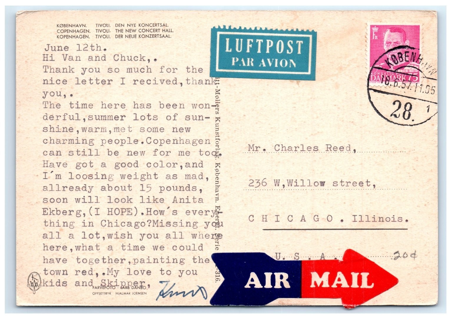 Postmarked from Copenhagen and addressed to Chicago, the card is an original printed by Farvefoto Lars Danbo and Hjalmar Joensen, noted Danish printers, making it a collectible piece of mid-20th century European postal history. The back includes a typed personal message dated June 12th and features colorful air mail labels and a Danish postage stamp. This postcard is perfect for collectors interested in Denmark, vintage travel ephemera, Copenhagen landmarks, or scenic night photography.