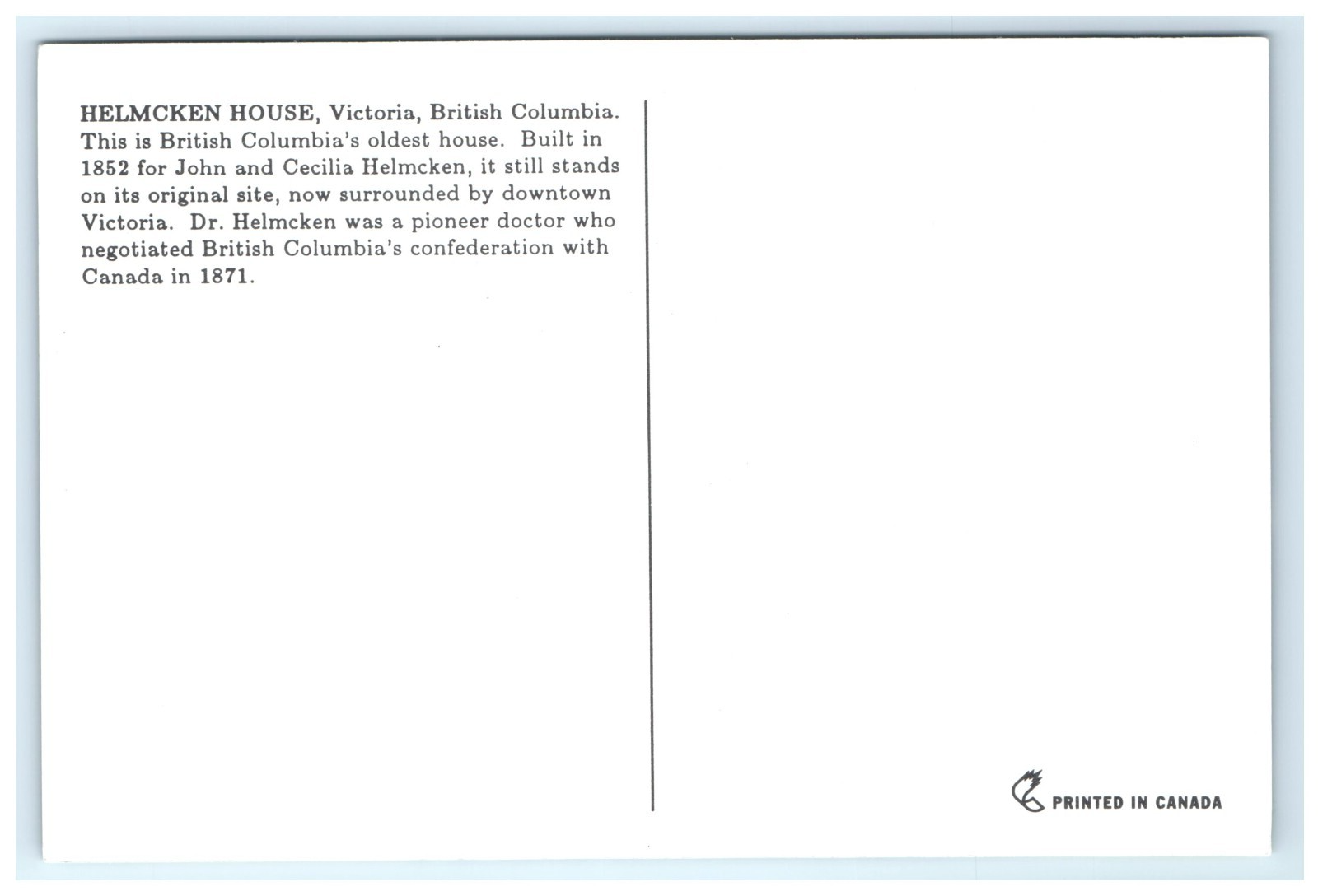 This postcard features the exterior of the historic 1852 Helmcken House in Victoria, British Columbia, one of the oldest residences in western Canada still on its original site. Built for Dr. John Sebastian Helmcken, a prominent figure in early British Columbia history, the house is now a heritage site that offers a glimpse into colonial-era life. The postcard highlights the architectural charm and historical significance of this well-preserved landmark in downtown Victoria.