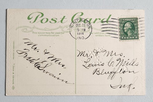 Vintage Divided Back Chrome Postcard Featuring Christmas Wishes and Winter Cabin Scene on Vintage Postcard Posted 1914.