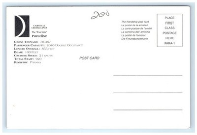 On the reverse, detailed ship specifications are provided including a gross tonnage of 70,367, a passenger capacity of 2,040 (double occupancy), length overall of 855 feet, beam width of 103 feet, cruising speed of 21 knots, and a total staff of 920. The ship is registered in Panama. The postcard is marked as an original and intended as a friendship card, with multilingual captions enhancing its collectible value. This piece is perfect for collectors of maritime memorabilia, cruise enthusiasts, and vintage travel ephemera.