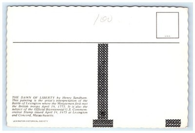 Published by the Lexington Historical Society, this original lithograph postcard highlights an important American history event and serves as a visual tribute to the courage of the Minutemen. Notably, the painting was also chosen as the subject for the Official Bicentennial U.S. Commemorative Stamp issued on April 19, 1975, celebrating 200 years since the battle at Lexington and Concord, Massachusetts. This postcard is a valuable addition for collectors interested in Revolutionary War memorabilia, historic art, and vintage American postal history.