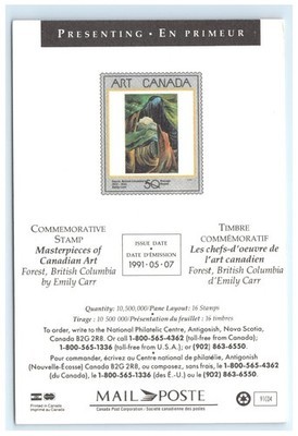 This collectible postcard features a commemorative stamp showcasing a masterpiece of Canadian art by Emily Carr. The detailed lithograph print depicts a forest scene from British Columbia, capturing the iconic natural landscapes that Carr famously painted between 1931-1932. The postcard highlights this artwork as part of the "Masterpieces of Canadian Art" series, issued by Canada Post on May 7, 1991.