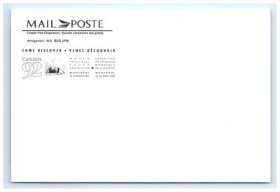 Produced by the Canada Post Corporation in Antigonish, Nova Scotia, this collectible postcard includes bilingual English and French text, highlighting its Canadian heritage and philatelic significance. The chrome finish adds depth and vibrancy to the images, making it a desirable item for stamp collectors and enthusiasts of Canadian natural history. It was also promoted at the World Philatelic Youth Exhibition in Montreal, 1992, adding to its collectible appeal.