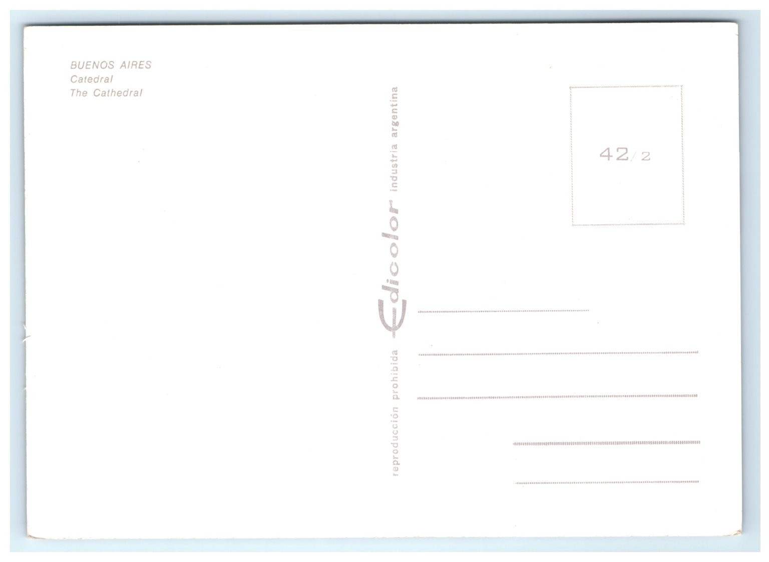 Published by Edicolor, a noted Argentine postcard publisher, this original printed lithograph reflects mid-20th century postcard artistry and production. The back of the card includes bilingual captions in English and Spanish, identifying the scene as "Buenos Aires Catedral The Cathedral." The postcard is unposted and printed on continental size (6 x 4 inches) paper with a glossy finish, ideal for collectors of South American or architectural postcards. Its unique historical context and classic design make it a valuable addition to any postcard or travel memorabilia collection.