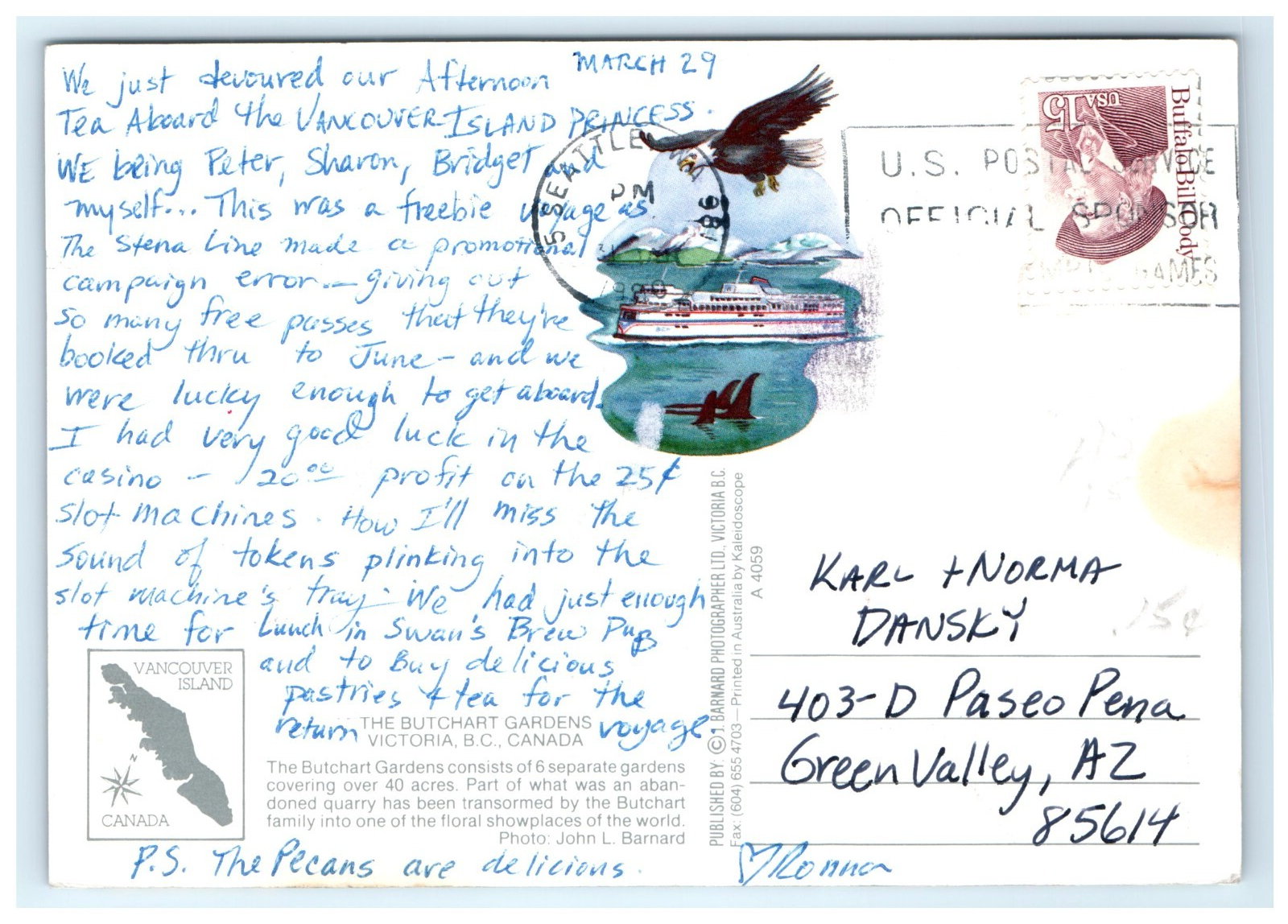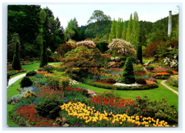 This postcard features the vibrant and meticulously landscaped Butchart Gardens in Victoria, British Columbia, Canada. Showcasing colorful flower beds, lush greenery, and stunning garden design, the image captures the beauty and tranquility of one of Canada?s most famous botanical gardens. The postcard highlights the seasonal blooms, scenic pathways, and serene atmosphere that make Butchart Gardens a top destination for visitors to Victoria.