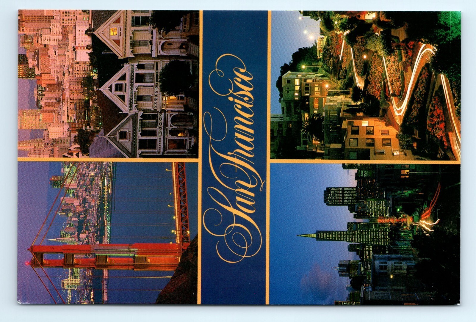 Vintage Divided Back Postcard Depicting San Francisco Highlights Including the Skyline Golden Gate Bridge Row Homes and Crookedest Street in San Francisco California.