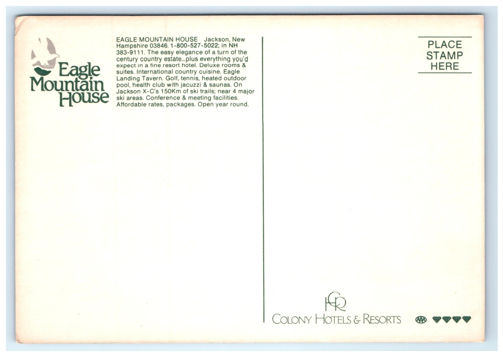 A picturesque winter scene of the Eagle Mountain House in Jackson, New Hampshire, showcasing its charming exterior surrounded by snow-covered trees and grounds. This postcard captures the cozy, rustic elegance of this historic mountain lodge, nestled in the heart of the scenic White Mountains. The tranquil winter setting reflects the peaceful beauty and inviting atmosphere of a classic New England getaway.