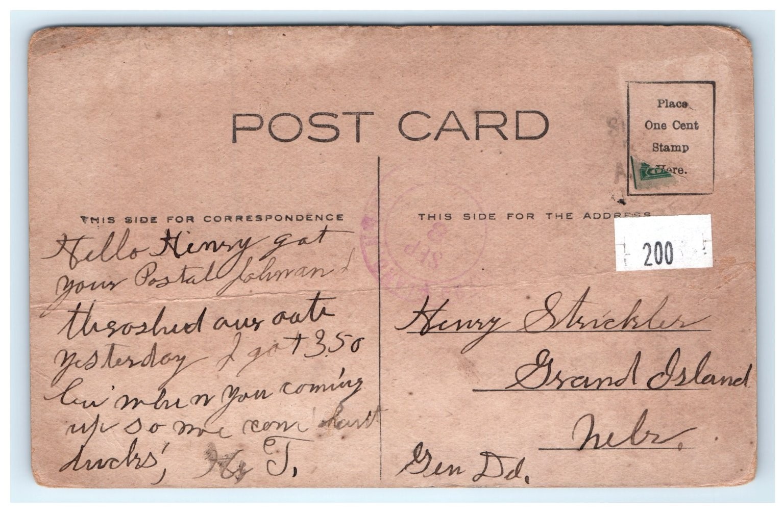 The postcard is postally used, addressed to Henry Strickler in Grand Island, Nebraska, with a hand-written message on the correspondence side, adding a personal historical touch. The message and postmark details enhance its collectible appeal, offering insight into everyday life and communication from over a century ago. This piece is a fine example of early printed humor cards, perfect for collectors of antique postcards or vintage Americana.
