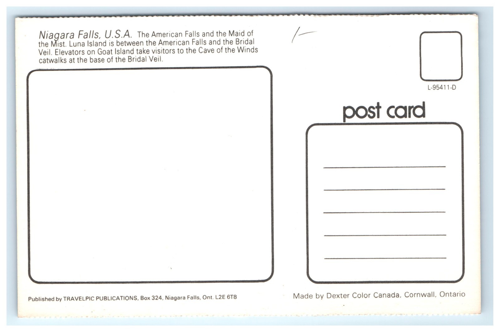 Published by Travelpic Publications of Niagara Falls, Ontario, and printed by Dexter Color Canada in Cornwall, Ontario, this lithograph postcard is a classic souvenir representing one of North America's most famous natural landmarks. The postcard is unposted and measures the standard 5.5 x 3.5 inches, making it a perfect collectible for enthusiasts of vintage travel memorabilia, natural wonders, or Niagara Falls tourism history. Its chrome finish enhances the vivid colors and scenic beauty, making it an attractive addition to any postcard or travel collection.