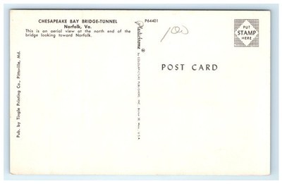 This vintage postcard features an aerial view of the north end of the Chesapeake Bay Bridge-Tunnel, looking toward Norfolk, Virginia. The image captures the expansive bridge-tunnel structure stretching across the water, surrounded by sandy shores and lush greenery, offering a striking perspective of this engineering marvel. The bright blue sky and calm waters enhance the scenic beauty and historical significance of this iconic location.