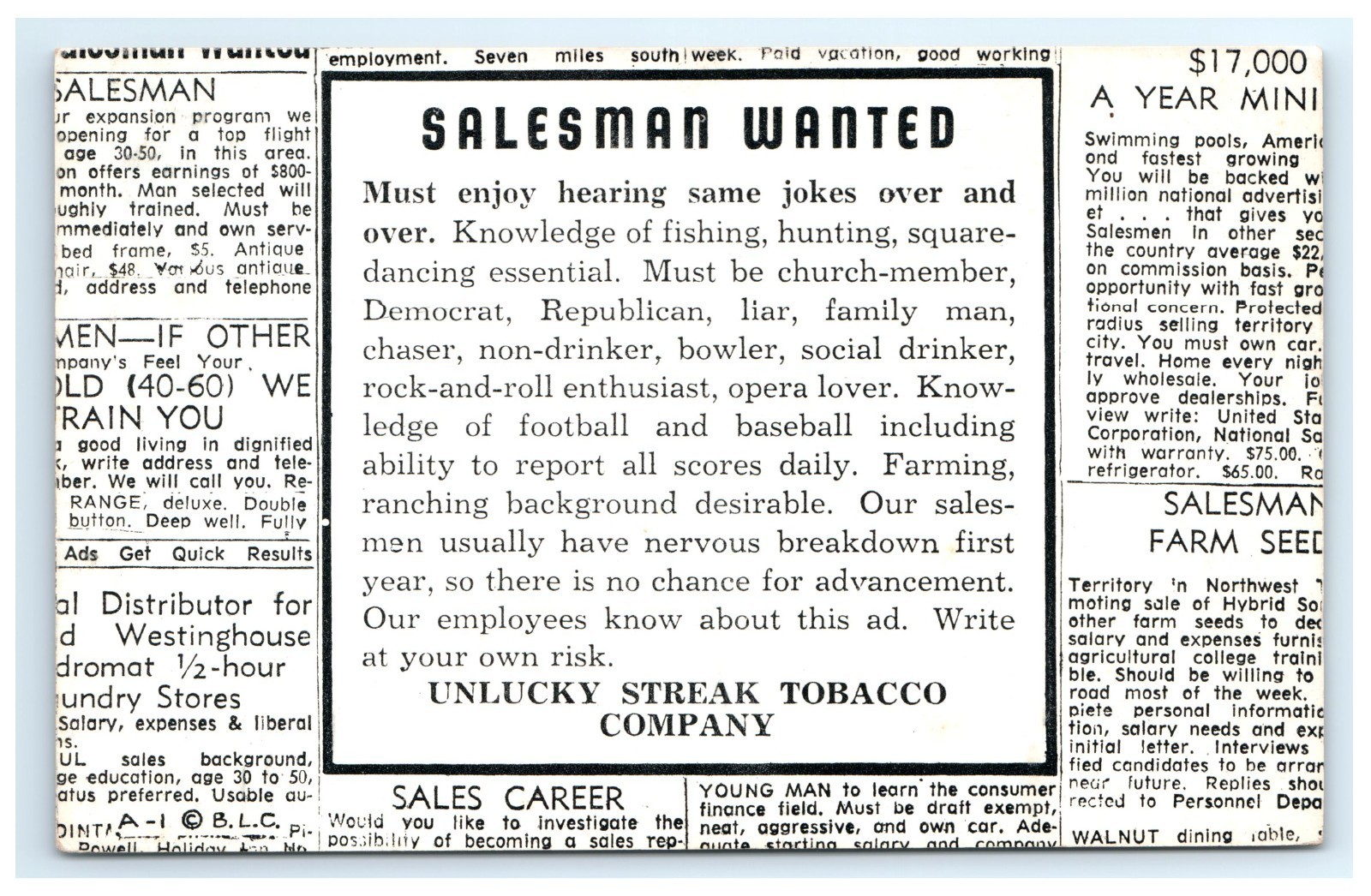 Add vintage advertising charm to your collection with this humorous ?Salesman Wanted? postcard from the fictional Unlucky Streak Tobacco Company. Featuring bold retro graphics and tongue-in-cheek copywriting, this postcard plays on classic tobacco ad tropes with satirical flair. Ideal for fans of vintage humor, novelty postcards, or antique advertising art, it captures early 20th-century Americana with a wink. Great for display in an office, man cave, or vintage ad collection, this postcard is a unique piece of printed ephemera with a clever twist on marketing gone wrong.