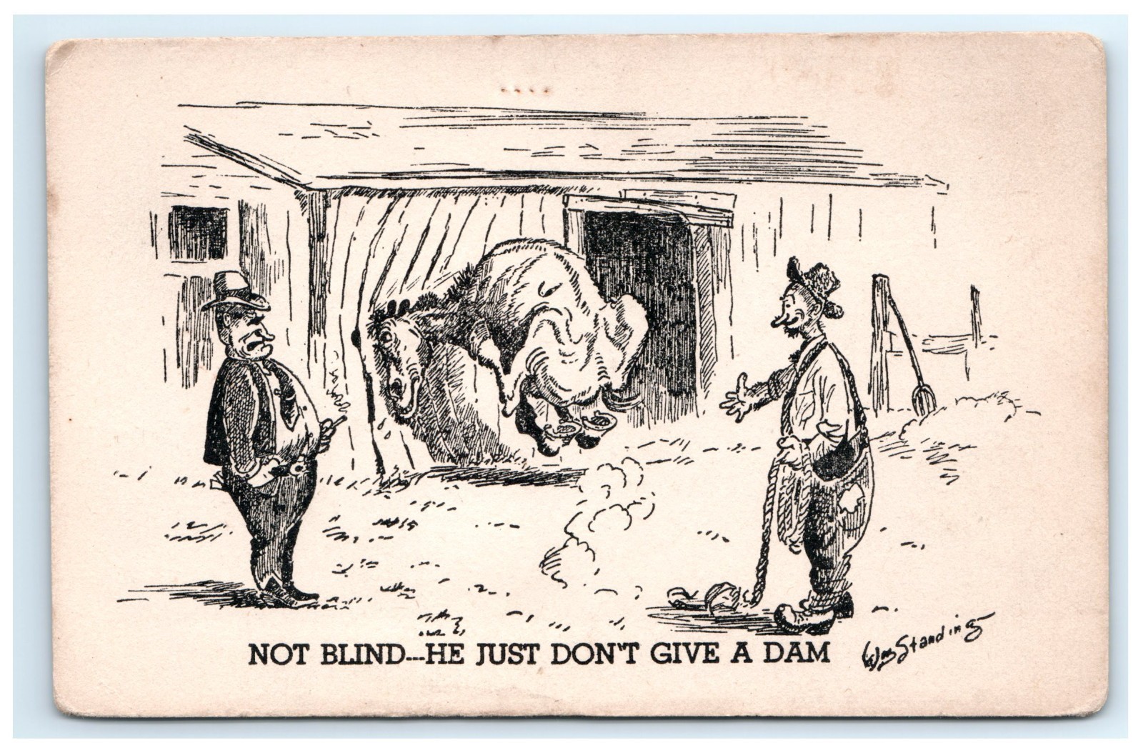 Add a touch of classic humor to your collection with this vintage ?Not Blind ? He Just Give a Etching? postcard featuring the distinctive style of artist Wm. Standing (William Standing). Known for his satirical and illustrative work, this card captures early 20th-century humor with a unique etching-style cartoon that reflects clever wordplay and social commentary. Perfect for those who appreciate vintage postcards, American cartoon art, or historical satire, this postcard showcases a moment of visual wit and cultural charm ideal for framing, mailing, or display.