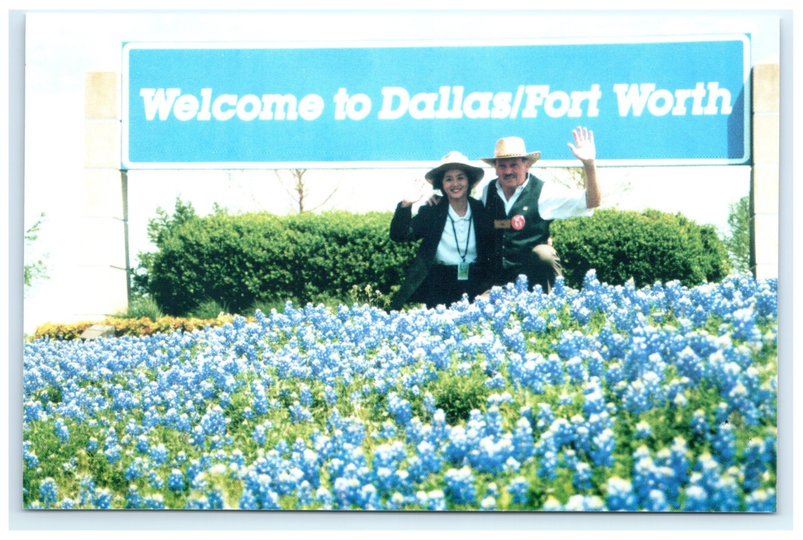 Vintage Divided Back Postcard Depicting Ambassadors at the Dallas Fort Worth Texas AIrport Garden Welcoming Visitors.