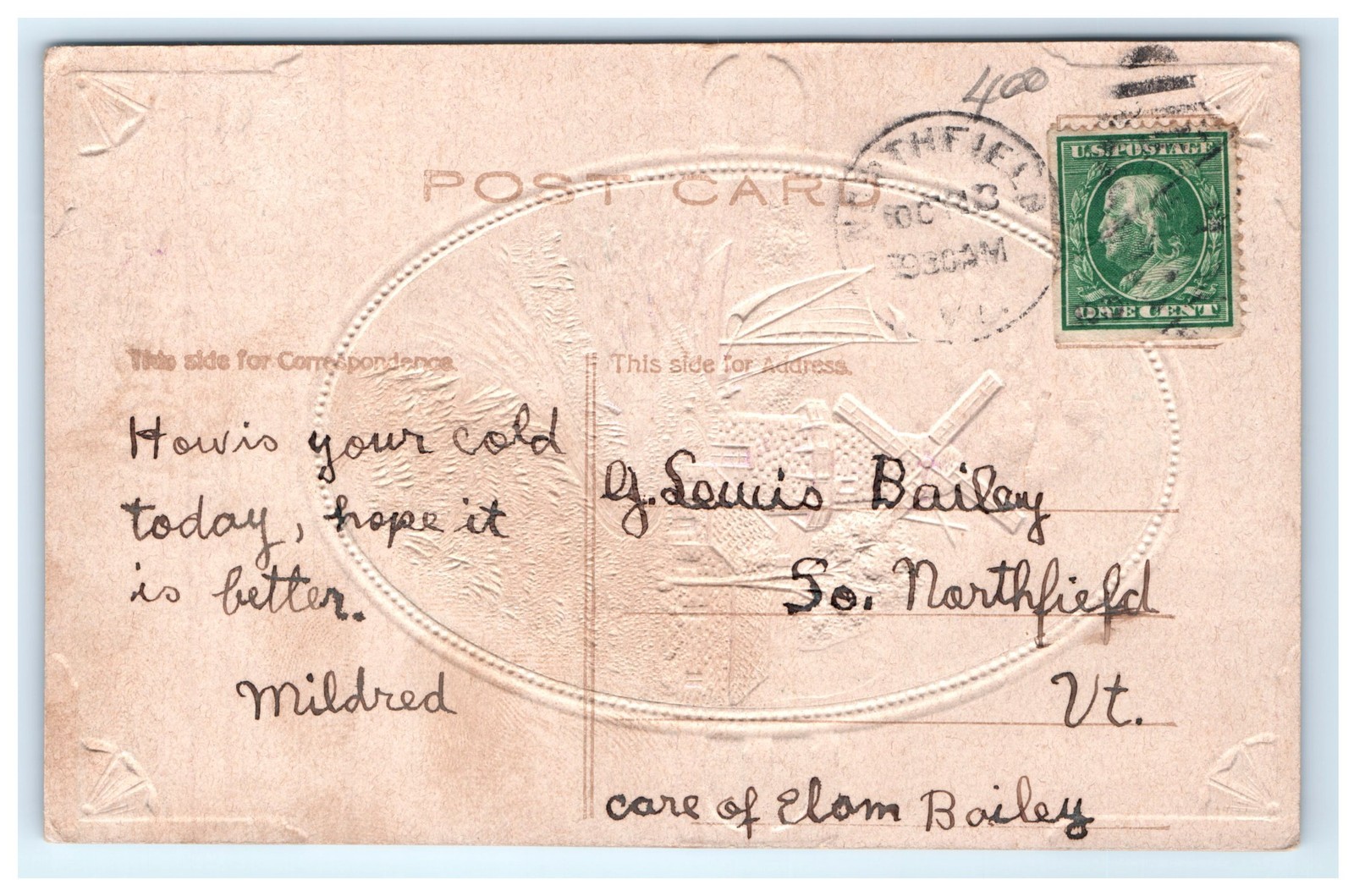 Postmarked October 13, 1908, with a one-cent U.S. postage stamp, this postcard offers a glimpse into early 1900s American postal history. The back is divided with space for correspondence and an address, with a handwritten note and recipient details from South Northfield, Vermont. The embossed image on the reverse echoes the front design, emphasizing the card's quality craftsmanship. This printed lithograph chromo postcard is an excellent collectible for those interested in vintage postcards, embossed ephemera, or early 20th-century Americana.