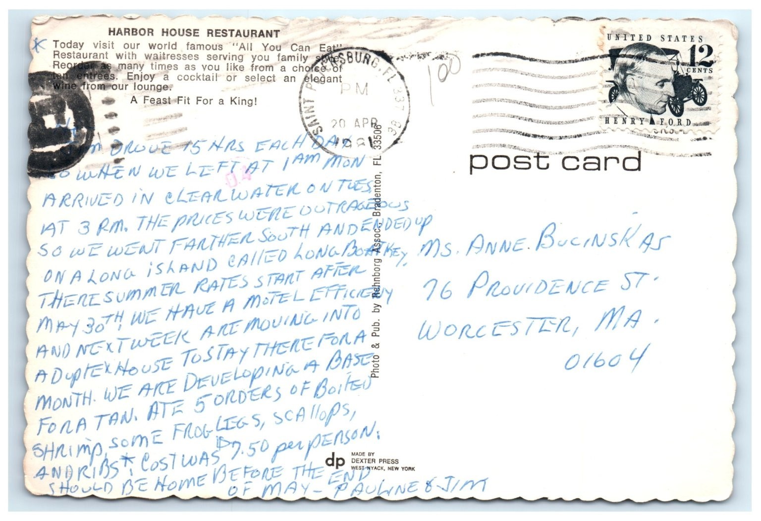 Produced by Dexter Press of West Nyack, New York, this original postcard measures the continental size of approximately 6 x 4 inches with its distinctive scalloped edges. The front displays bright, clear color images capturing the restaurant's exterior and signage against a coastal backdrop with palm trees and vintage vehicles, reflecting the casual beach atmosphere. The reverse side includes a handwritten message dated April 20, 1968, stamped from Saint Petersburg, FL, alongside a 12-cent Henry Ford postage stamp, adding historical and collectible significance.