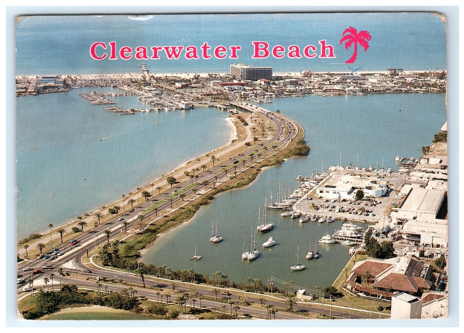This vintage postcard features a stunning aerial view of Clearwater Beach, Florida, showcasing the picturesque palm-lined causeway that connects Clearwater to Clearwater Beach. The image captures the serene marina with numerous sailboats docked, the expansive waterways, and the beachfront skyline, including hotels and buildings that highlight the area's mid-to-late 20th century development. The vibrant lithograph printing technique brings out the rich colors of the water, sky, and lush greenery, emphasizing the postcard's appeal as a collectible souvenir.