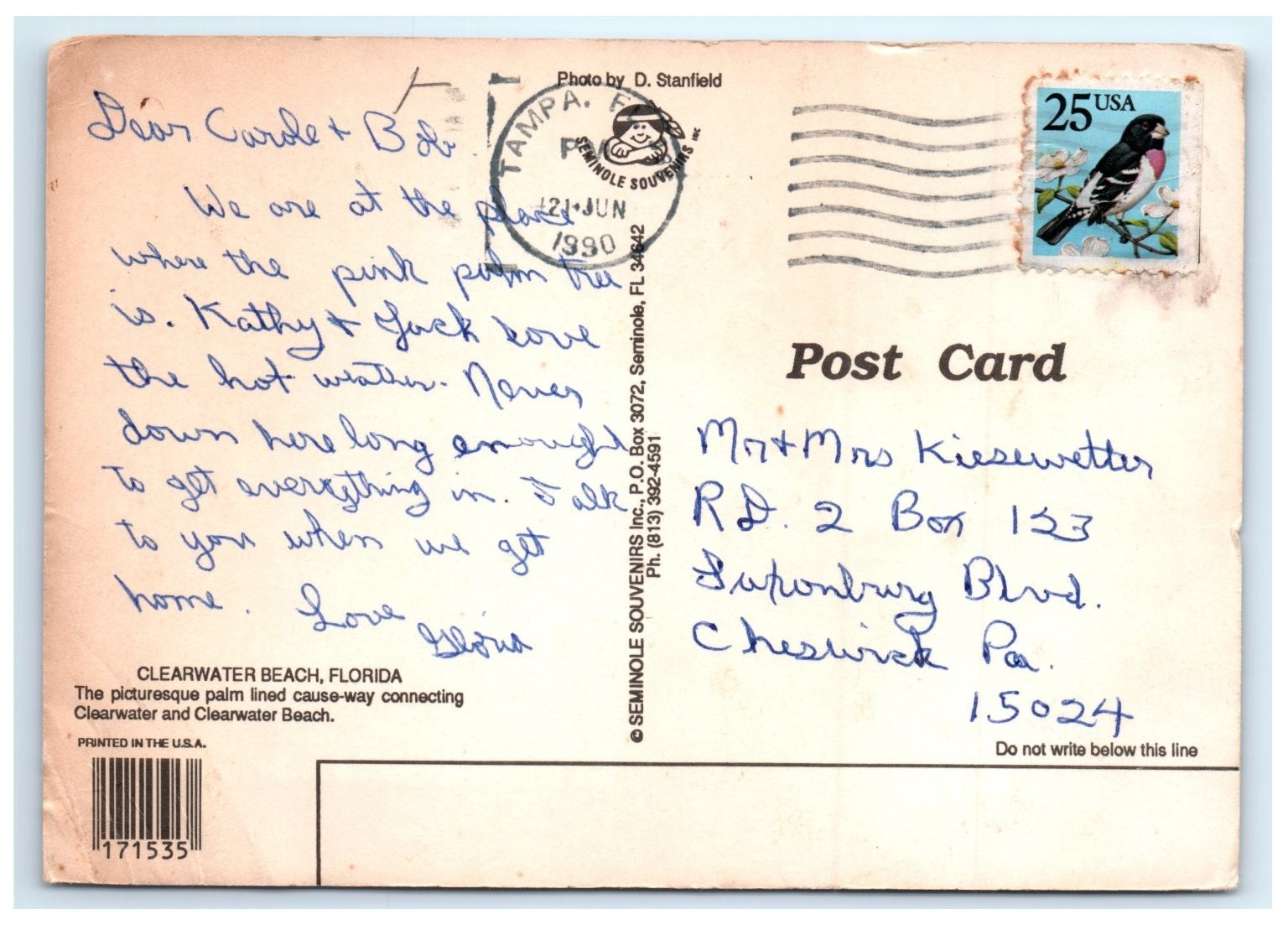 Printed by Seminole Souvenirs Inc. and photographed by D. Stanfield, this continental-sized (6 x 4 inches) postcard is a nostalgic keepsake from 1990, as evidenced by the postmark dated June 21, 1990. The back contains a handwritten message and a 25-cent USA bird stamp, adding to its authenticity and charm. This postcard is ideal for collectors interested in Florida landmarks, vintage travel memorabilia, or coastal American scenes. It captures a moment in time of one of Florida's most beloved beach destinations.