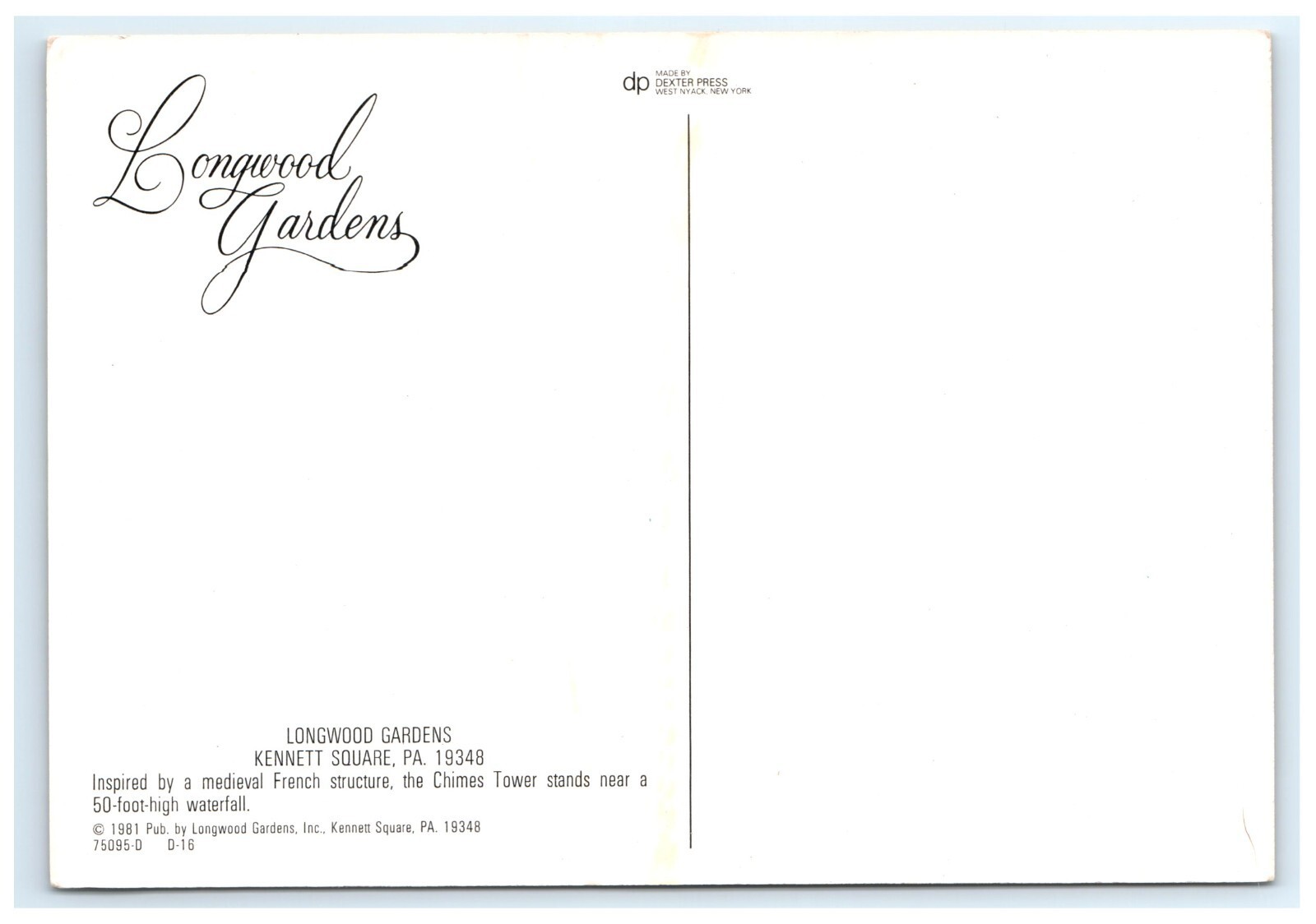 Vintage Divided Back Postcard Depicting Chimes Tower in Longwood Gardens Kennett Square Pennsylvania.