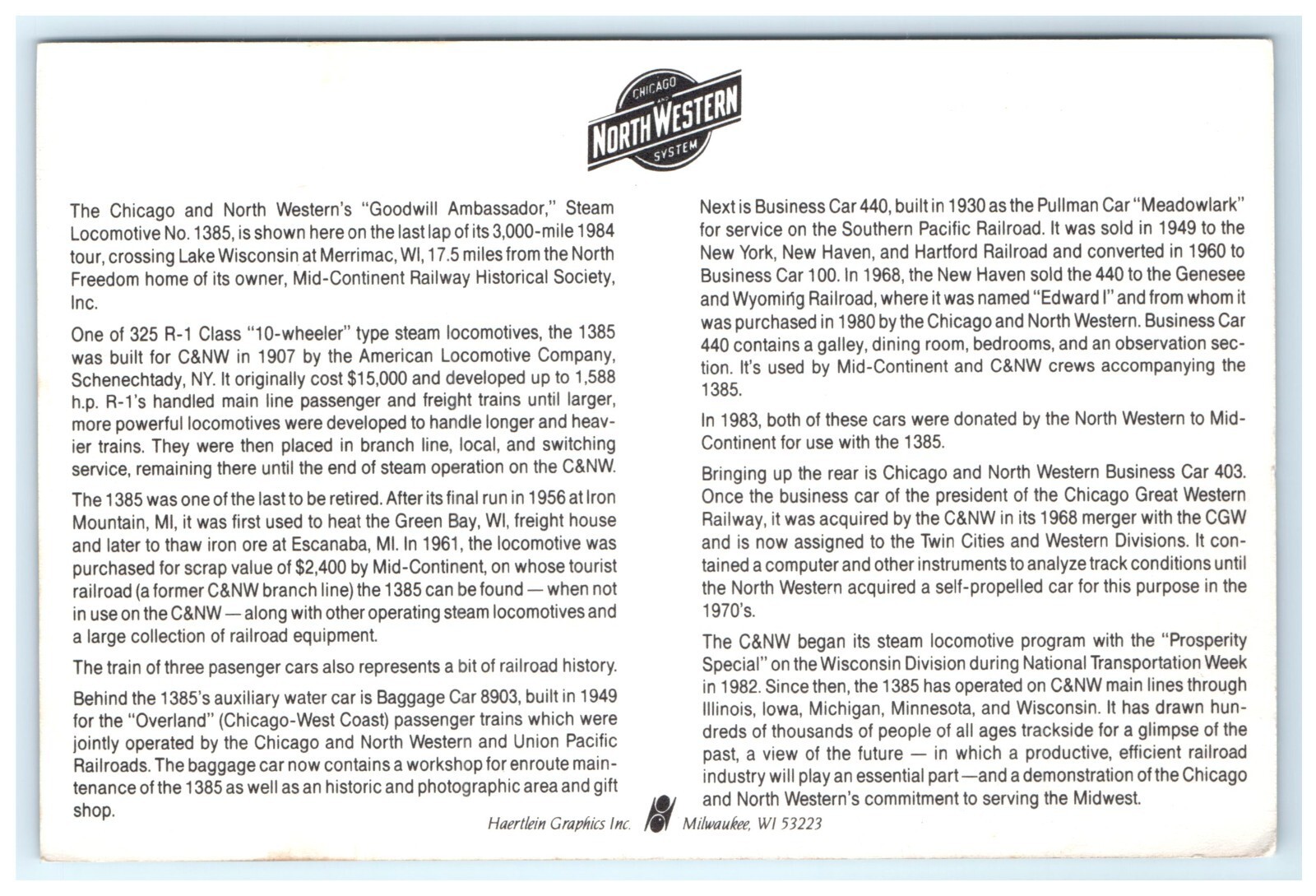 Train Chicago Northwestern Goodwill Ambassador Locomotive 1385 History Postcard