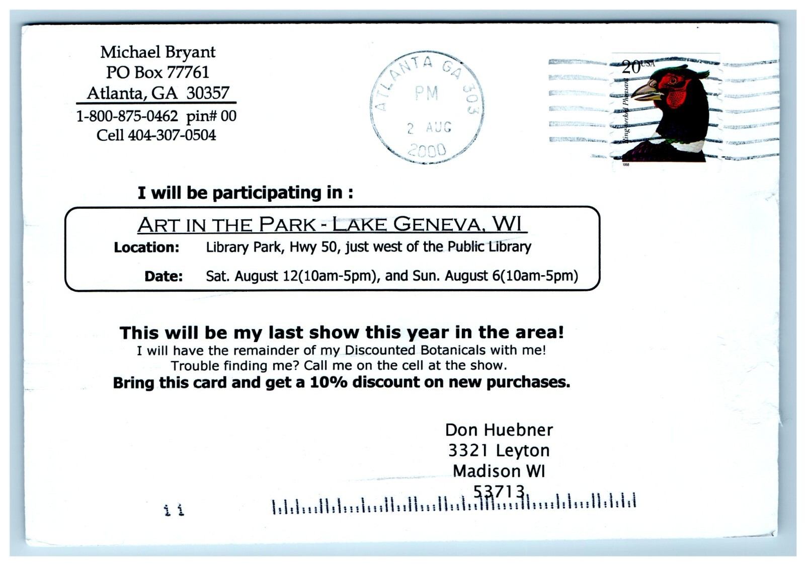 Vintage Divided Back Postcard Depicting Art of Michael Bryant at Art In the Park Located in Lake Geneva Wisconsin.