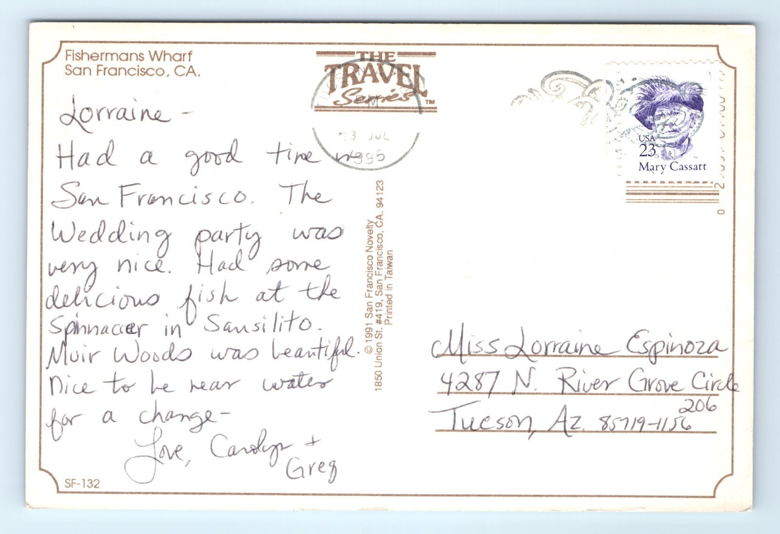 Sailboats Fishermans Wharf San Francisco CA Postcard Posted
