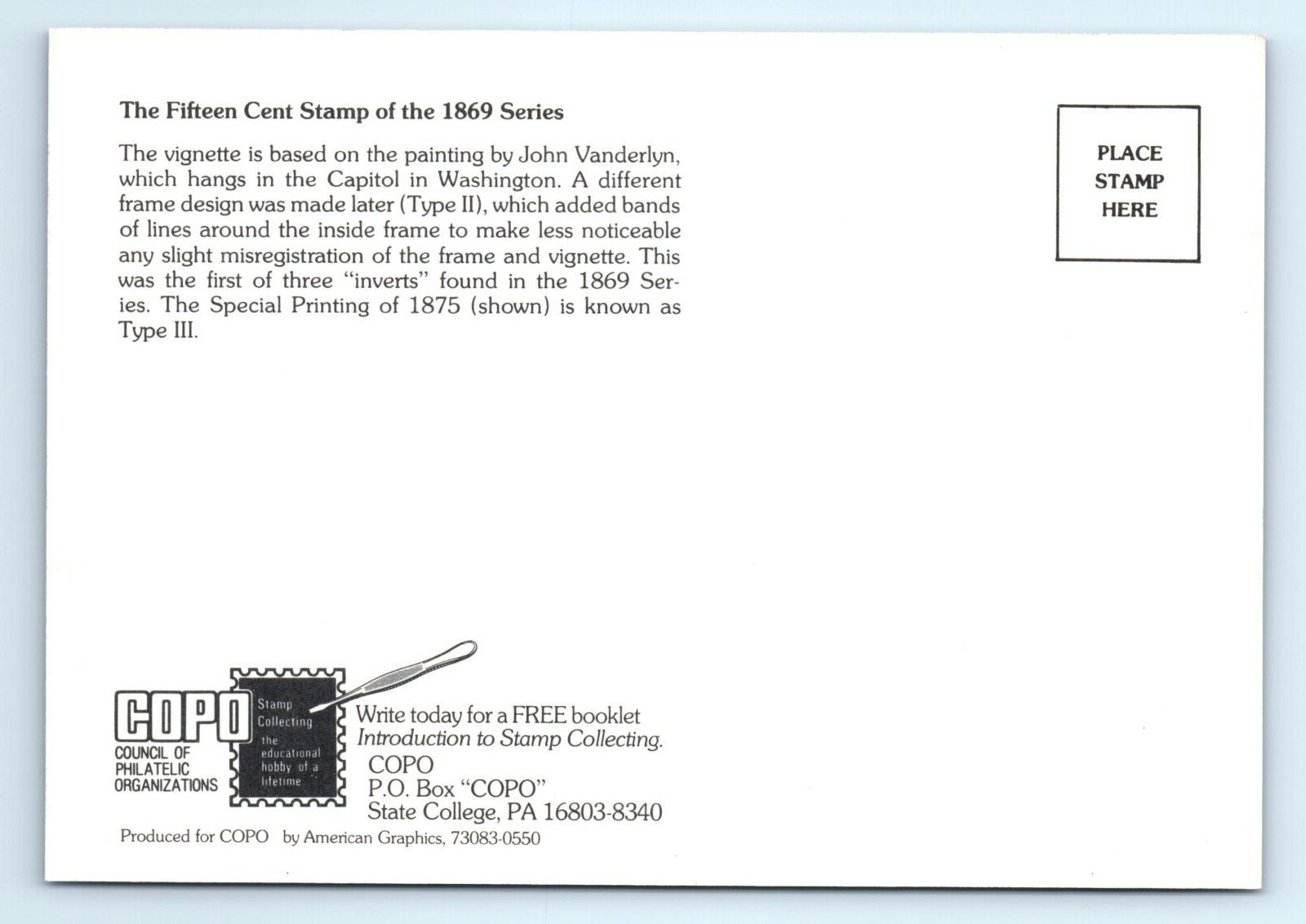 Vintage Divided Back Postcard Depicting the Fifteen Cent Stamp of the 1869 Series by the Council of Philatelic Organizations.