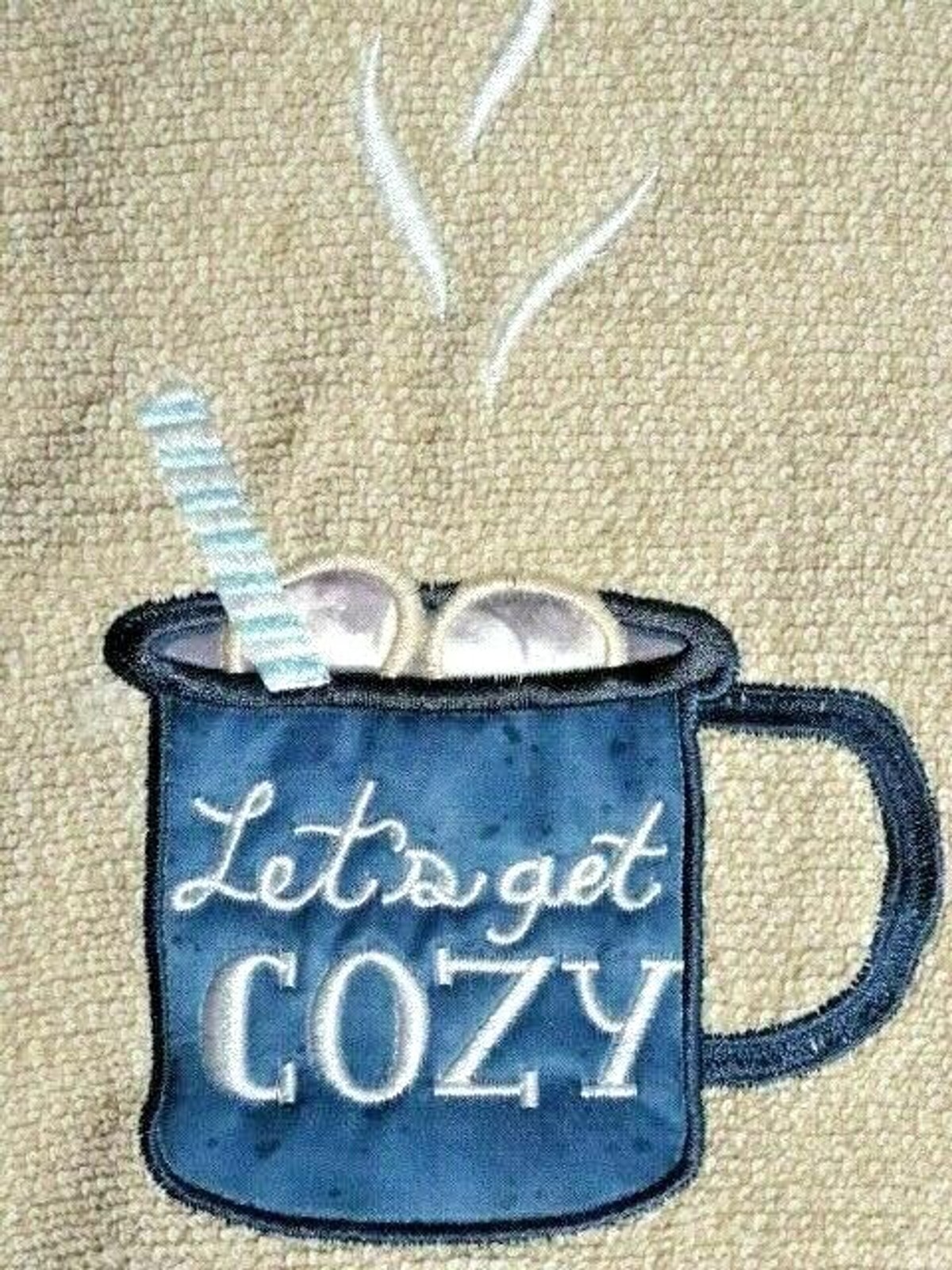 Cup of Cozy Coffee Mug Kitchen Towels Embroidered Applique Blue Brown 2pc Gift