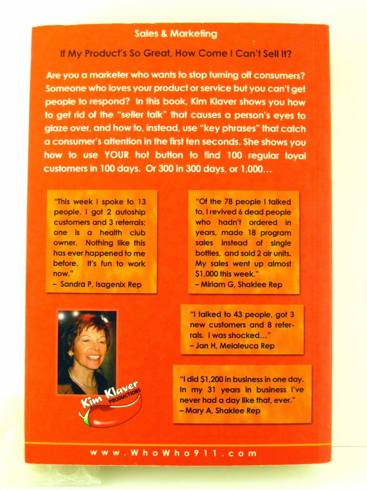 The product is a nonfiction book titled "If My Products Are So Great, How Come I Can't Sell Them?" by author Kim Klaver. Published in 2004 by Max Factory Out! Productions, the book offers insights into marketing, networking, and business economics. With a vintage style and paperback format, this 343-page trade paperback is written in English and illustrated by Gillian Riley. The book is ideal for those looking to enhance their sales and marketing skills in a business setting.