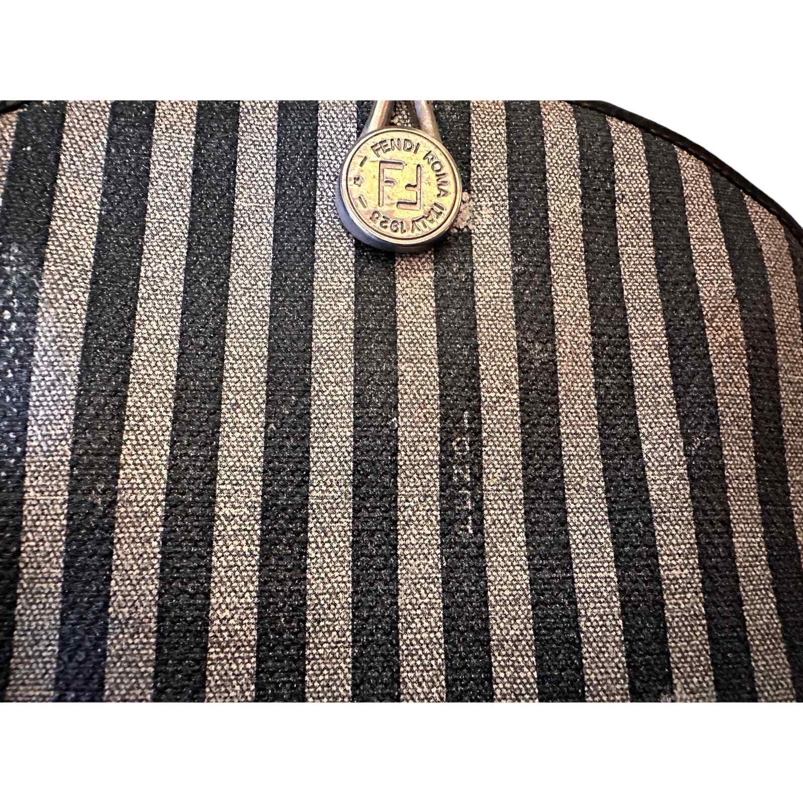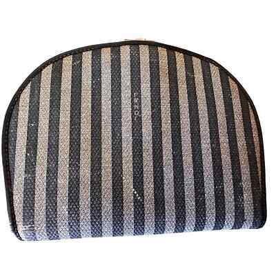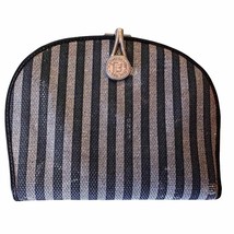 The wallet is made of a fine gray-brown and black striped coated canvas and black leather with a silvertone 'FF' hinged closure. Inside, half of the rounded shape interior is a large coin purse with snap closure. The other side has slots for your cards and a longer rear slot for your cash. The black leather interior is in good vintage condition!