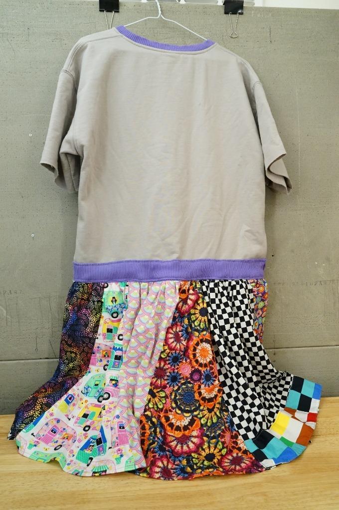 Clean. No smoke or pet odor. Beatles Love Cirque Du Soleil XL Jersey Sweatshirt Multi Pattern Skirt Dress. A colorful blend of jersey and cotton materials. 36" from collar to hem. Raw cut edge short sleeve. 22" across the chest when flat. It has pockets on both sides at the waist. We have never seen another one like this.