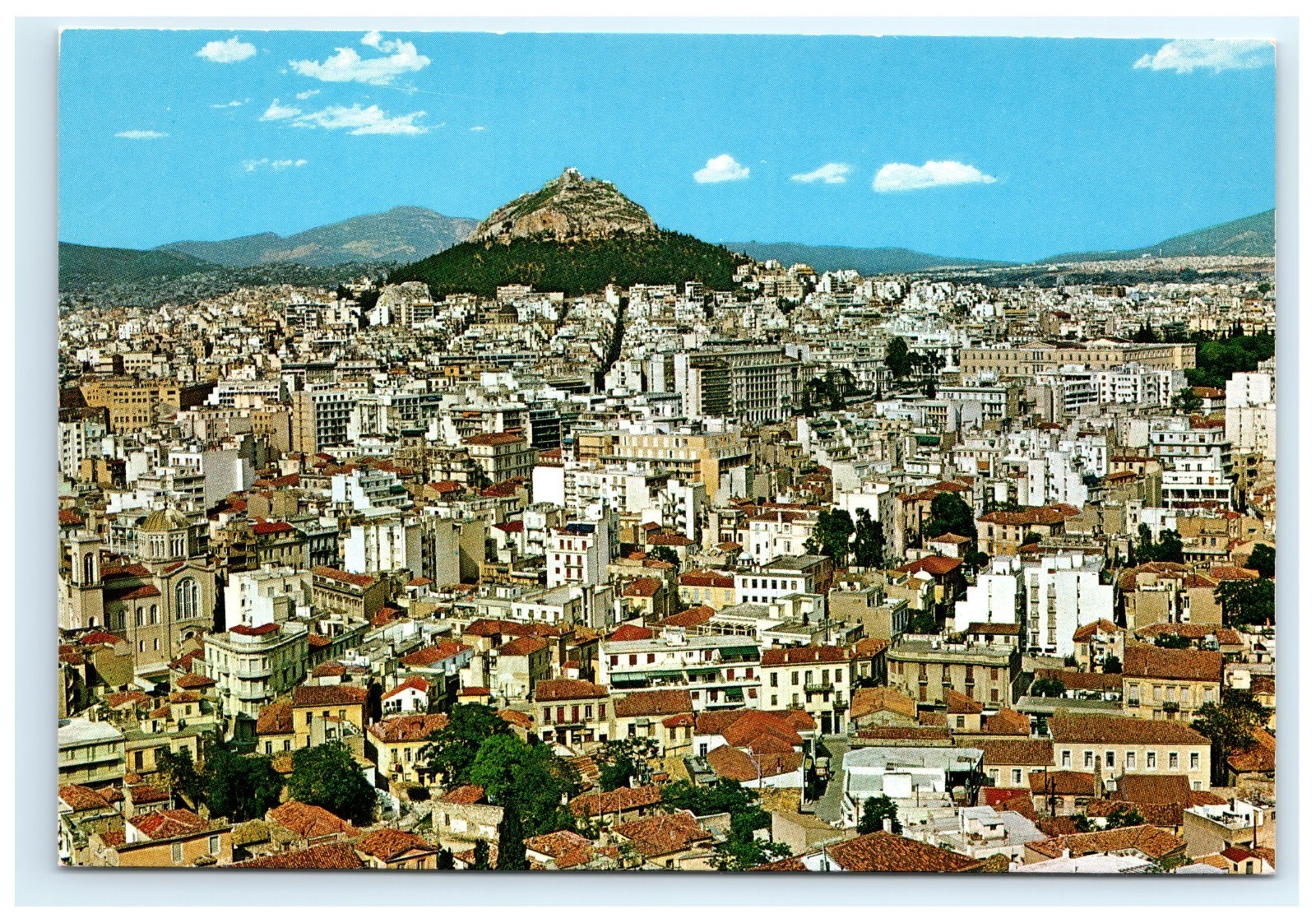 This postcard offers a panoramic view of Athens, Greece, with Mount Lycabettus rising above the bustling city skyline. The image highlights dense urban buildings, charming red-roofed homes, and surrounding mountains beneath a vivid blue sky, showcasing the character of the Greek capital.