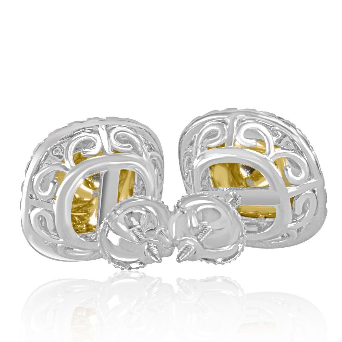 Charming stud earrings will add magic to special moment! These earrings feature 0.97 carat cushion cut natural fancy yellow diamond center stones surrounded by a halo of colorless and yellow round cut diamonds in micro pave setting. Handcrafted in 14k two-tone gold and secure with screw back closure. The total carat weight is 1.73 carats.