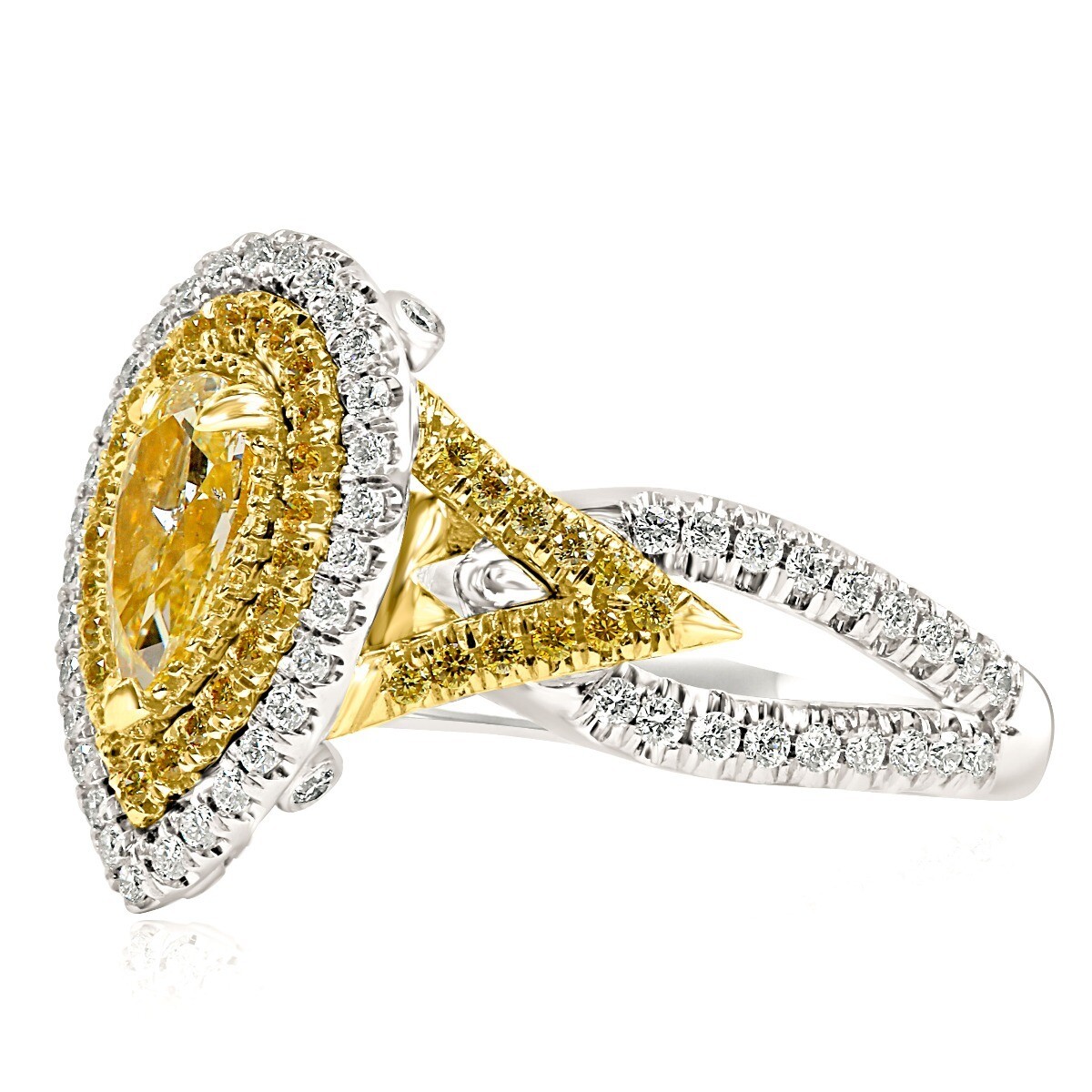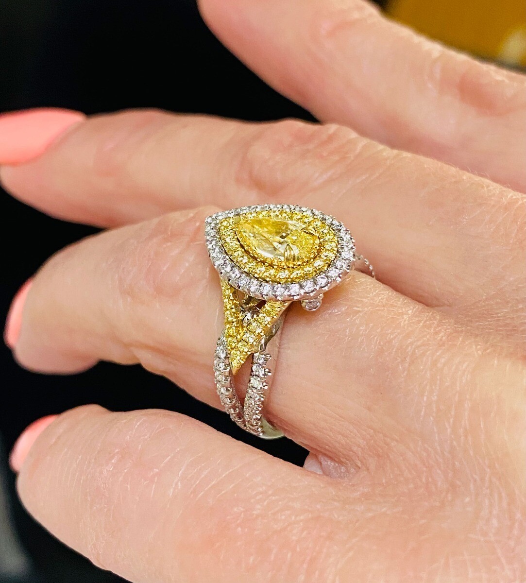 Gia 1,55 ct forma di pera fantasia fidanzato giallo anello alone oro bianco 18k