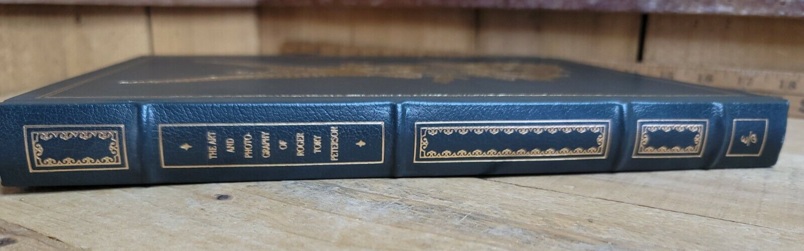A large format hardcover, leather bound, with a place holder satin ribbon stitched into the sewn binding, gold gilt on the edges of the the text block. 202 pages, including index, biographical information, detailed information on Peterson's field guides on bird watching, and of course hundreds of examples of the art and photography of Mr. Peterson.
