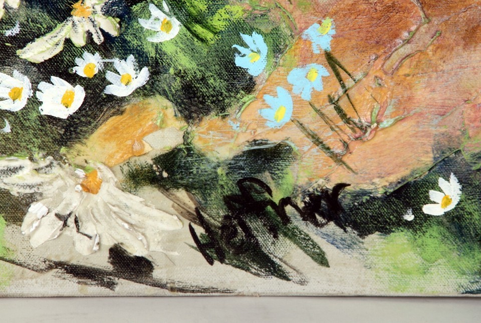 Lynne Heffner: Untitled - Children Playing, Flowers & Trees Oil Painting Signed
