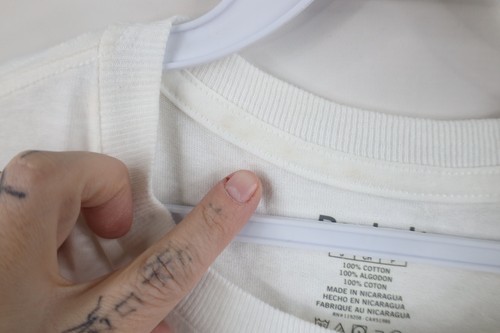 New with defects. Stain front top right. Blemished inner collar