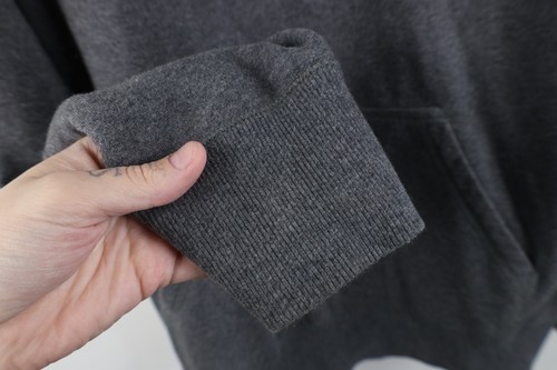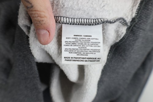 Stains front bottom hem. Dark spots. Hood, cuffs discolored. Color faded. Pilling. String distressed