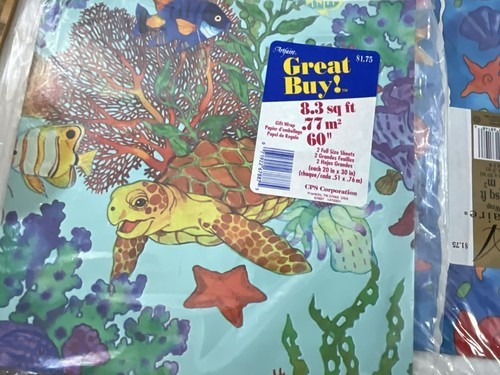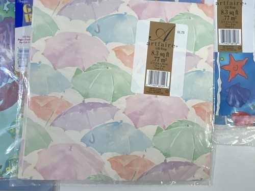 This is a lot of 7 assorted new old stock wrapping paper. Six of the packages are made by Artfaire and one package is by Creations Plus. All are unopened and cute for a summer theme or sea theme.