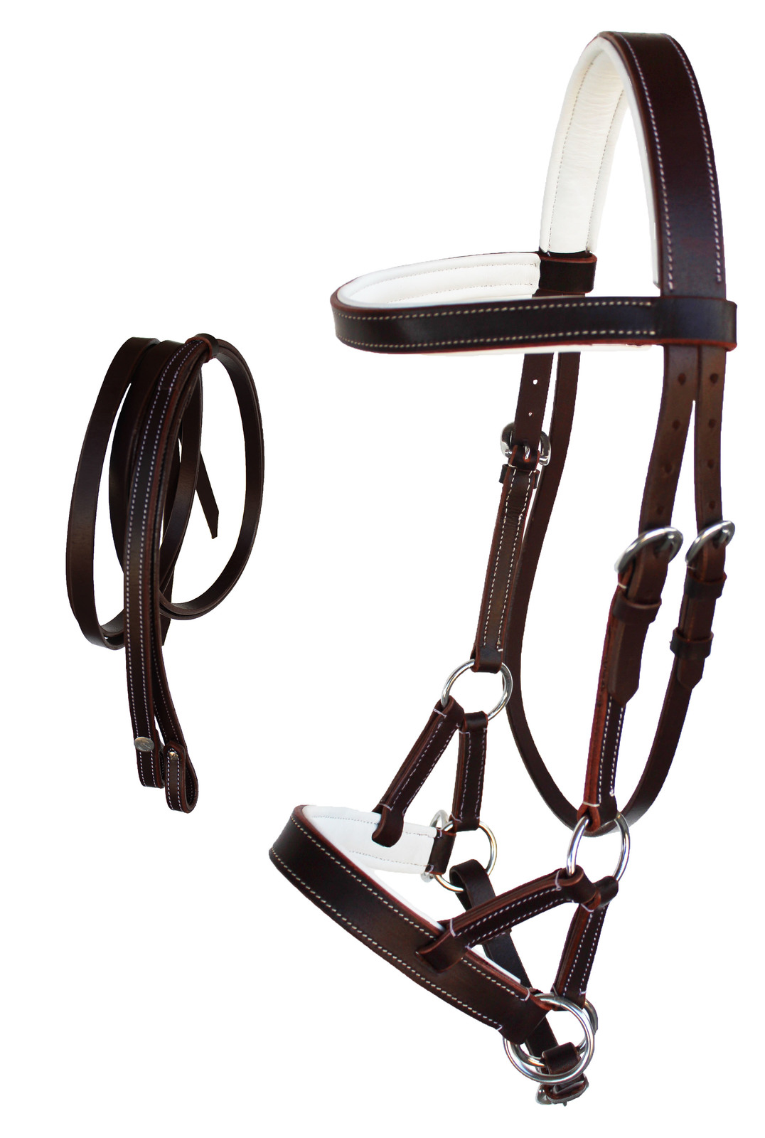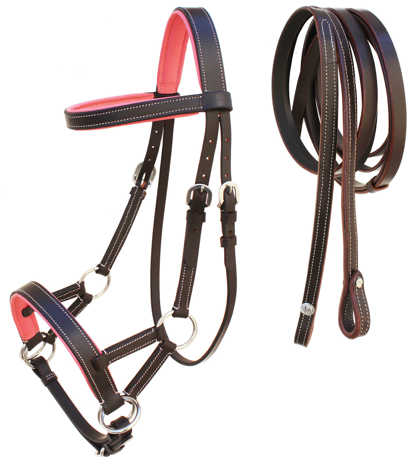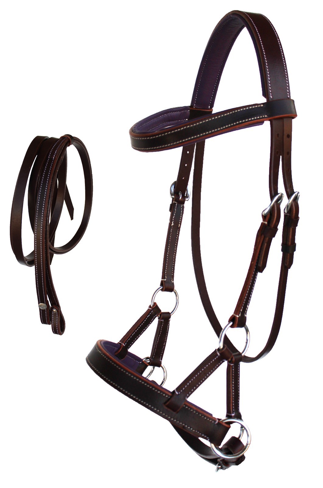Padded side pull bridle makes the perfect choice training aid. Bridle features a comfortable colored padded browband and noseband. All hardware is stainless steel and bridle comes double stitched for durability. Set of 5/8" wide by 7' long reins complete the set.