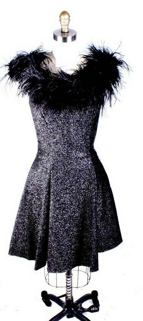 Provenance Note: Nadine was a popular mid-tier eveningwear brand in the 1980s, producing glittering cocktail dresses, prom gowns, and party minis. Their feather-trimmed lurex styles epitomize the excess and glamour of the decade, making them fun and collectible today for retro party looks and 80s costuming.