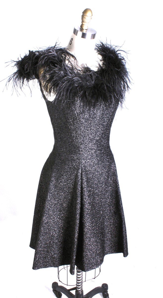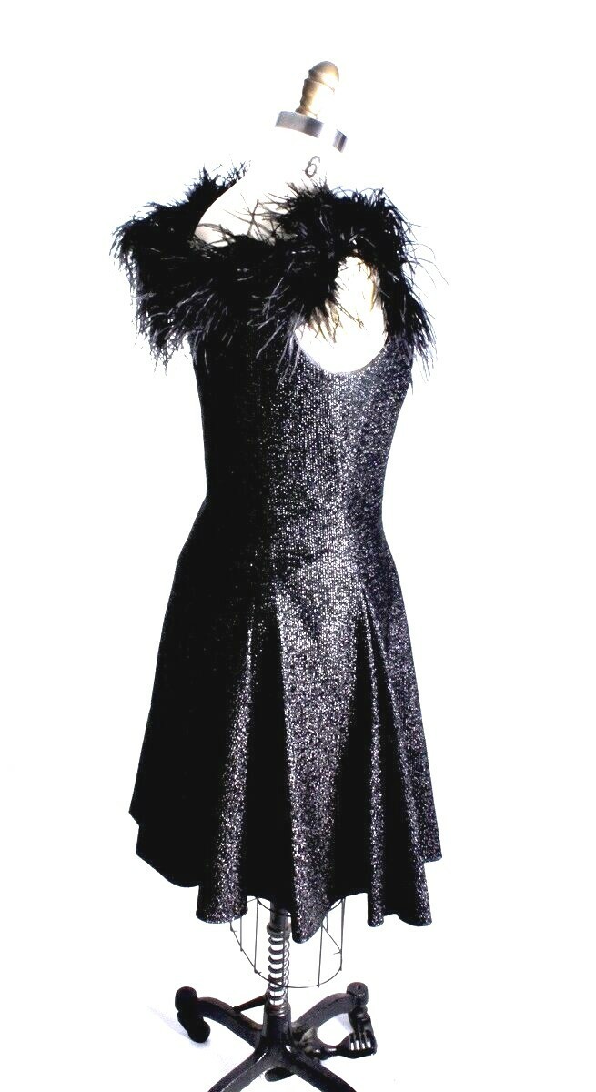 VTG 80s Nadine Black Lurex Strapless Cocktail Mini Dress Feather Trim S/M 34B