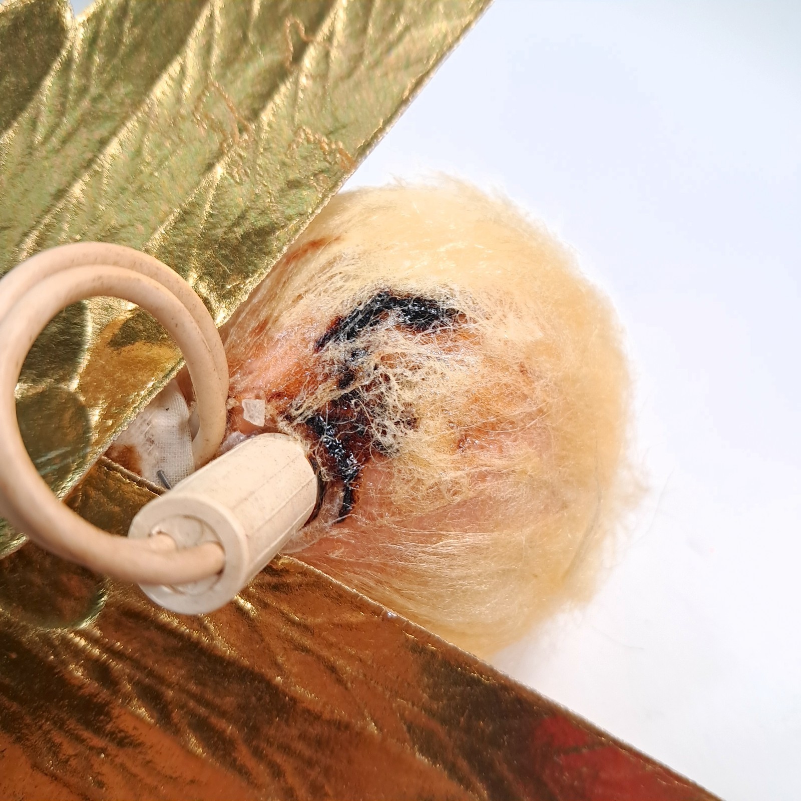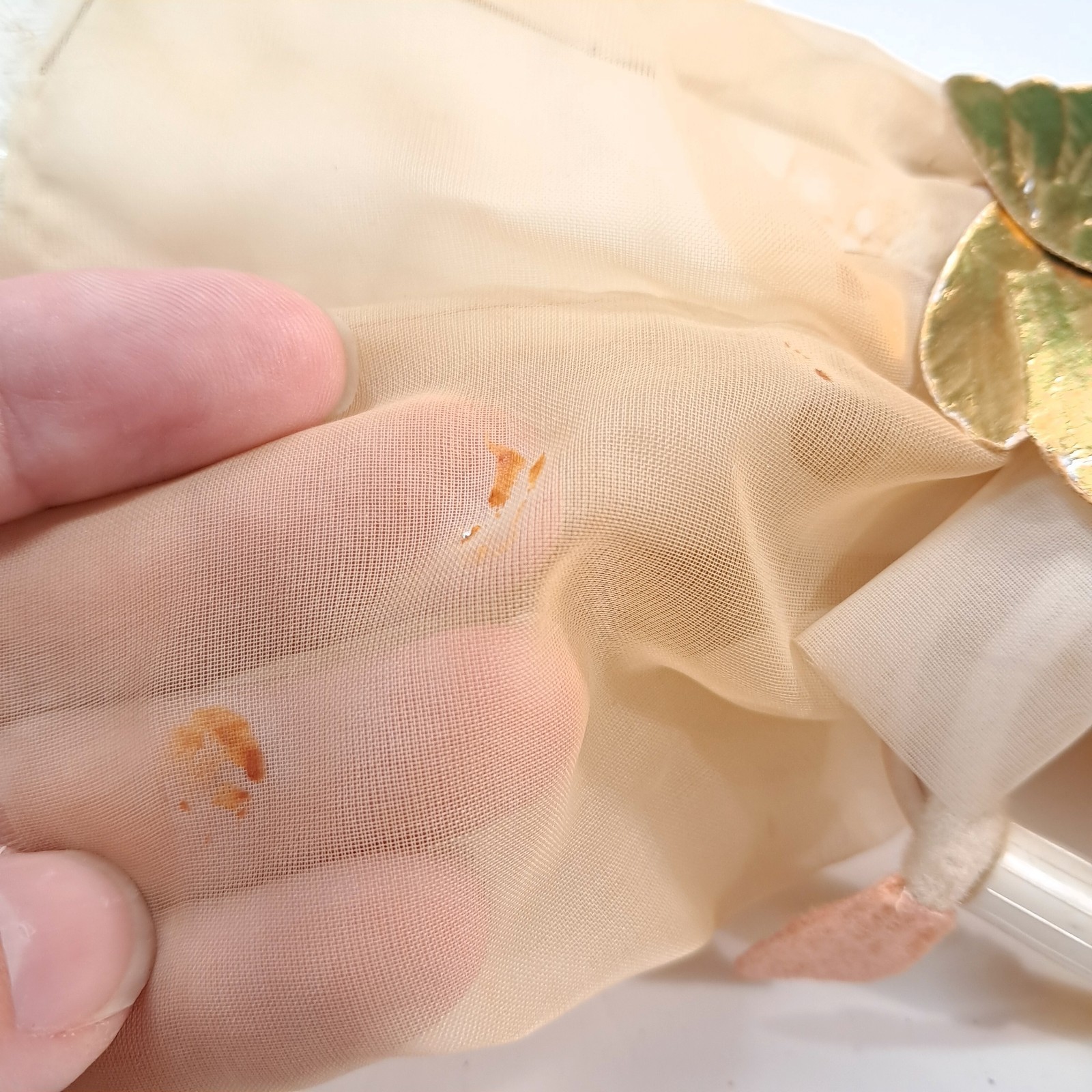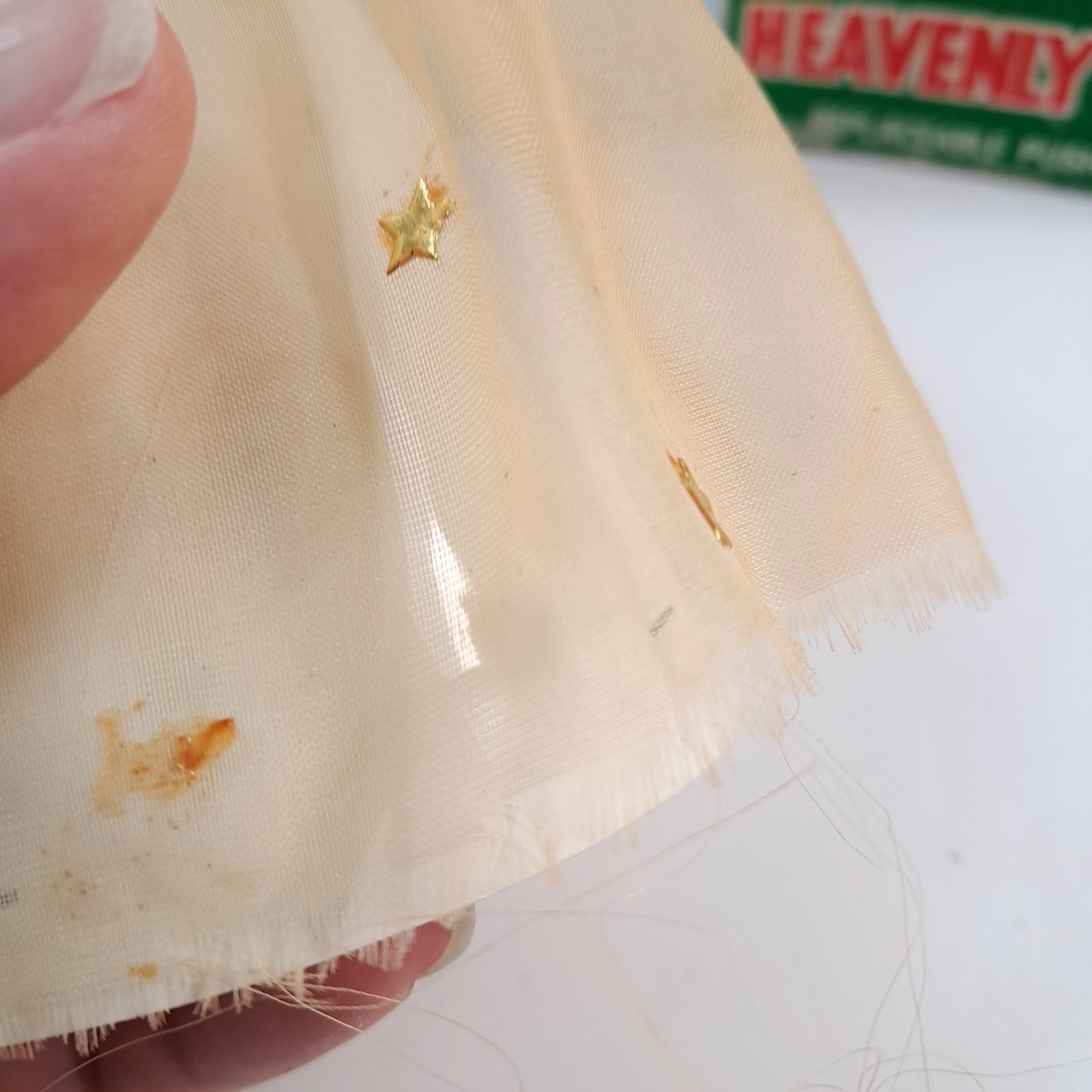 Lights work. Face has wear/marks, back of the head has some kind of glue or something that discolored, Glue marks on dress and fraying at edges of dress. General scuffs/wear as shown. Box has wear. See all pics.