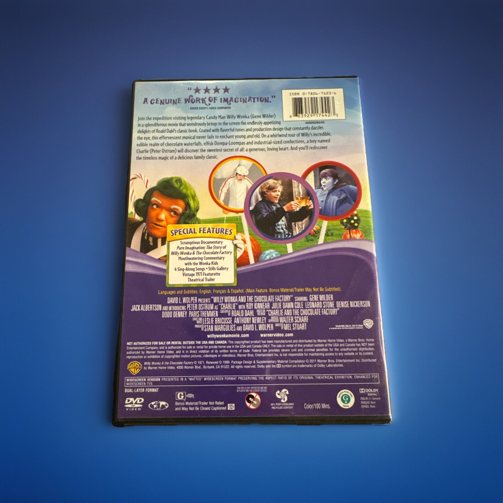 The product is a DVD of the movie "Charlie and the Chocolate Factory," featuring Gene Wilder as Willy Wonka. Released by Warner Bros in 2011, this family-friendly film falls under the genres of Fairy Tale and Children's Family. The DVD is in Widescreen format with English language options, and it comes in a Tall/DVD Case. This standard edition DVD is rated G, making it suitable for all audiences to enjoy the whimsical and magical world of Willy Wonka's chocolate factory.Please look at our store for unique collectibles and quality vintage items.