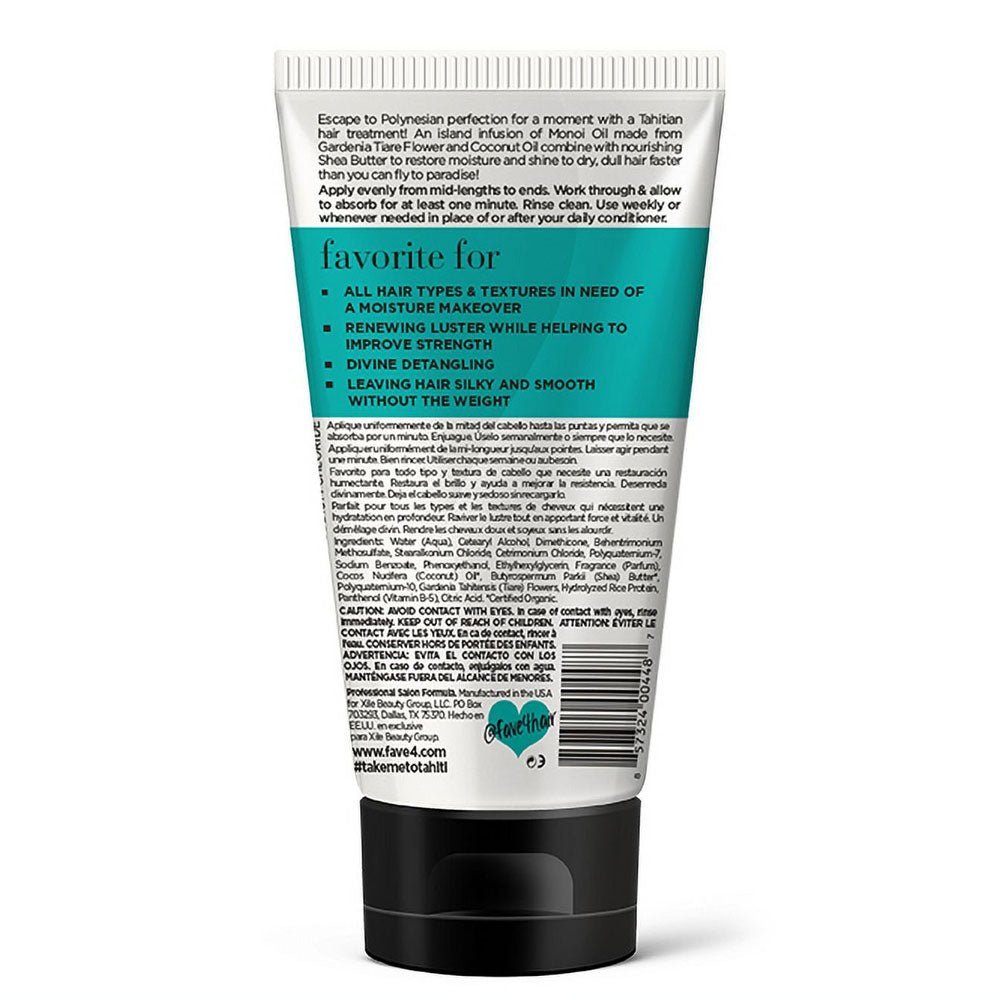 Quench your hair's thirst with Fave4 Take Me to Tahiti One Minute Moisture Mask, a super-rich, fast-absorbing treatment that restores moisture, strength, and shine in record time. Infused with an island-inspired blend of Monoi oil (from Gardenia Tiare flower and organic coconut oil), organic shea butter, and rice proteins, this mask nourishes dry, dull hair without weighing it down.