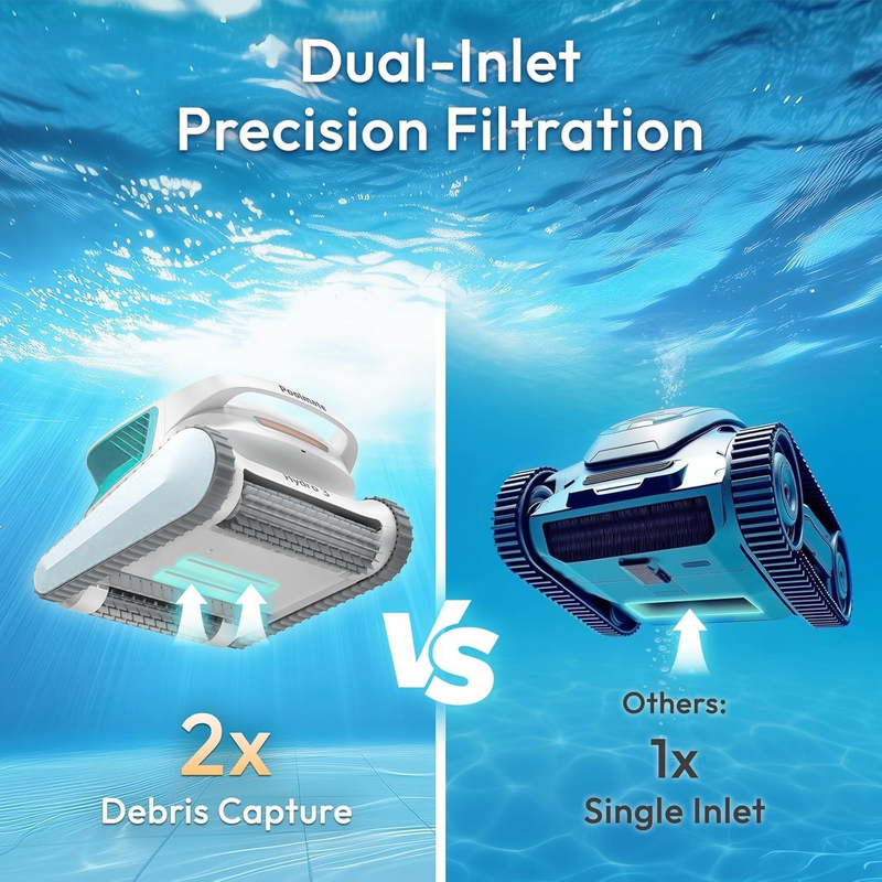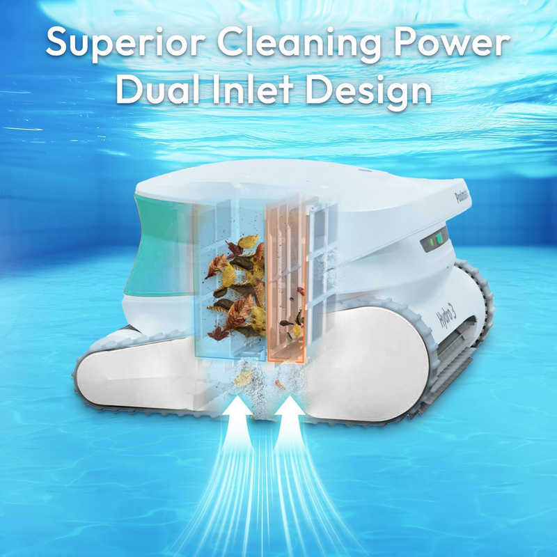 Dual Inlet System for Efficient Cleaning: The innovative dual inlet design enhances water flow across the pool?s bottom, efficiently capturing dirt and debris of all sizes. Even when the main filter chamber is filled with larger debris, the secondary filter chamber ensures uninterrupted wall climbing and thorough waterline cleaning, maintaining optimal performance throughout the cleaning process