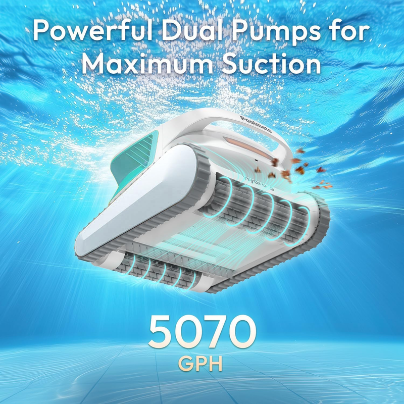 Powerful 5,070 Gallons Per Hour Filtration System: Featuring twin turbo centrifugal brushless motors, this pool vacuum generates exceptional suction power that effectively captures and removes fallen leaves, fine sediment, fibers, hair, and stubborn debris from both pool floors and walls, resulting in visibly cleaner water and reduced chemical requirements